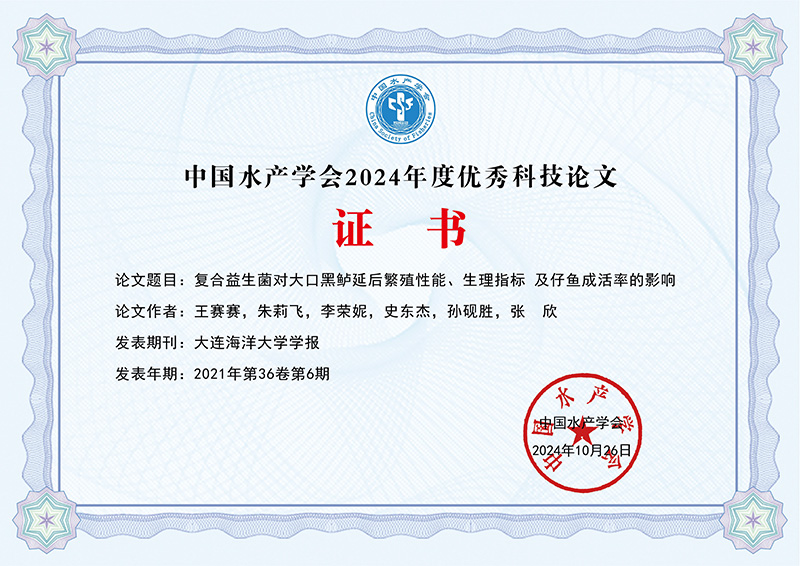 One paper published in the Journal of DLOU was given an award for Excellent Scientific Paper 2024 by the China Society of Fisheries.