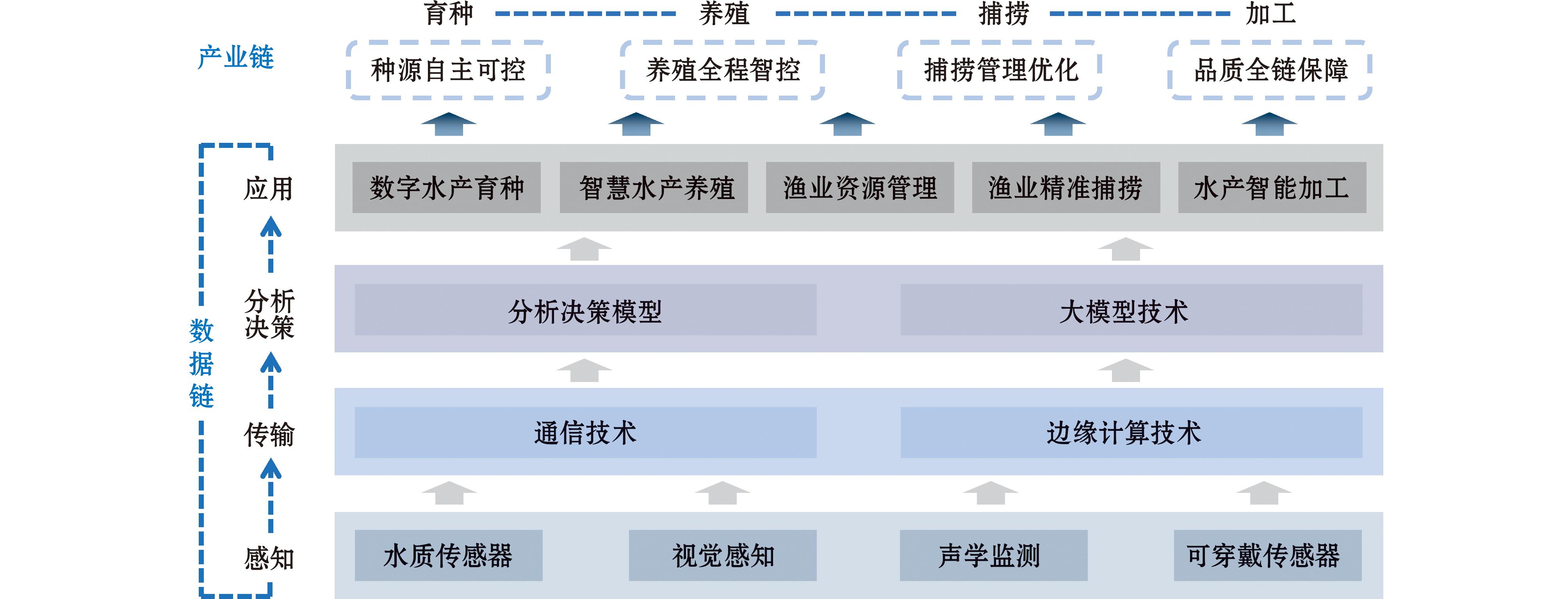 智慧渔业是一种以数据、知识和先进装备为核心驱动力的现代渔业生产模式与综合解决方案(图1)。该模式依托现代信息技术,实现人、机、物的全面互联,推动渔业生产的全方位感知、精准传输、智能决策与高效应用。同时,智慧渔业通过数据驱动贯通“种-养-捕-加”全产业链及各环节,形成覆盖水产育种、养殖、捕捞、资源管理、收获、储存与加工的智能化、绿色化生产体系。