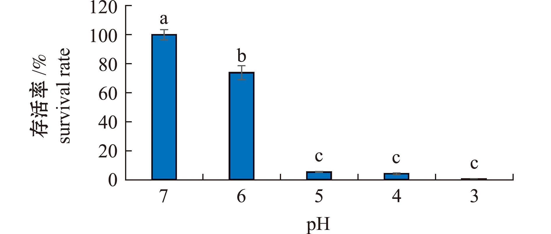 2.4.1 菌株耐酸性 通过体外模拟试验评估菌株AC27的耐酸特性(图4)。结果显示:该菌株在不同pH环境中的存活率呈现显著的梯度变化,当环境pH值降至5.0和6.0时,其存活率分别下降至73.80%和5.25%;在pH 为3.0和4.0的极端酸性条件下,菌株AC27仍保持部分生物活性,存活率分别为0.4%和4.12%;所有酸性处理组的存活率与对照组均存在显著性差异(P<0.05)。这表明,菌株AC27具有显著的耐酸特性,在酸性环境能维持基础代谢活性,这为其作为潜在益生菌株在消化道中的定植能力提供了关键的试验依据。