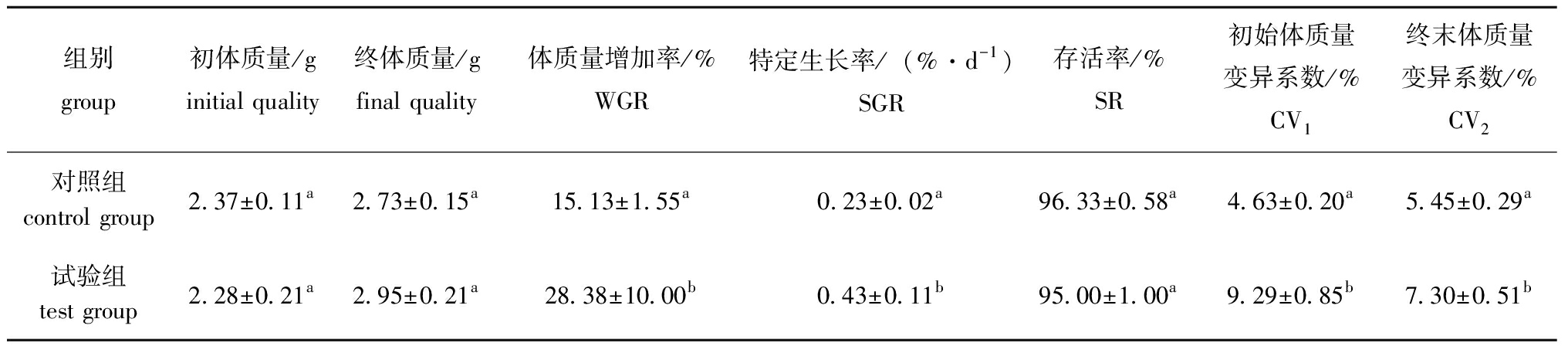 组别group初体质量/ginitial quality终体质量/gfinal quality体质量增加率/%WGR特定生长率/(%·d-1)SGR存活率/%SR初始体质量变异系数/%CV1终末体质量变异系数/%CV2对照组control group2.37±0.11a2.73±0.15a15.13±1.55a0.23±0.02a96.33±0.58a4.63±0.20a5.45±0.29a试验组test group2.28±0.21a2.95±0.21a28.38±10.00b0.43±0.11b95.00±1.00a9.29±0.85b7.30±0.51b