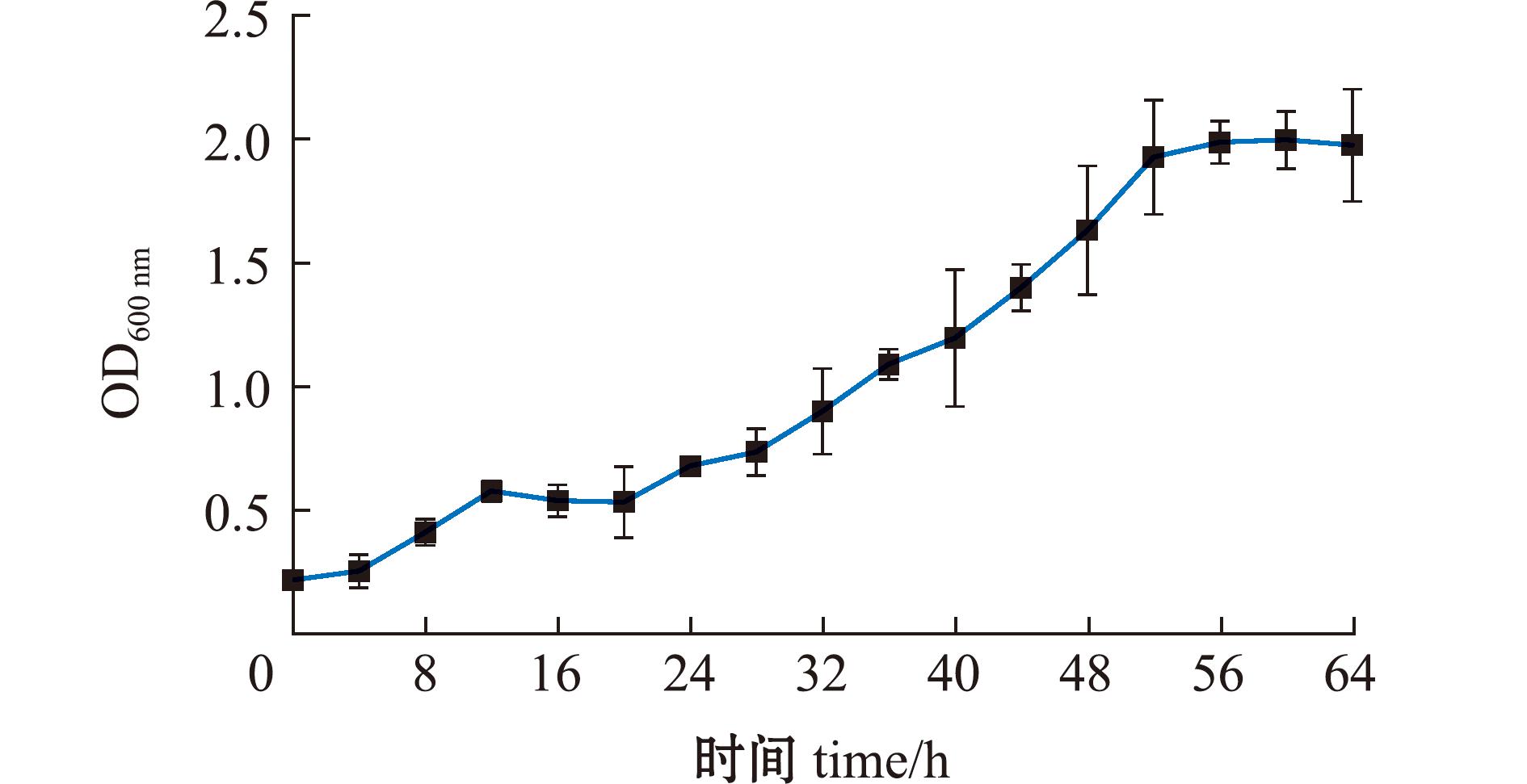 刺参肠道产酶菌株AC27在2216E液体培养基中30 ℃下以120 r/min摇床培养的生长曲线如图3所示。菌株AC27生长延滞期为0~16 h,培养24 h后进入对数生长期,培养48 h后进入稳定期,对数生长期菌液OD600 nm值为0.7~2.0。