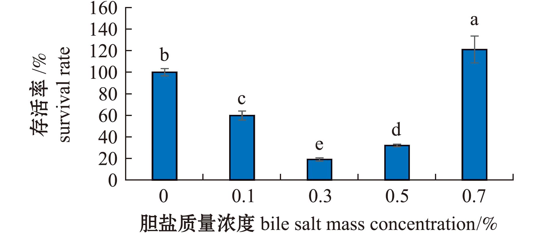 2)菌株耐胆盐能力试验参照Damayanti等[21]的方法,稍作修改。将菌株接入2216E液体培养基进行活化,将活化后的菌液以2%浓度接种于胆盐浓度为0.1%、0.3%、0.5%、0.7%的2216E液体培养基中,在30 ℃下以120 r/min摇床中培养24 h。于24 h取样,测定每株菌种的OD600 nm值,并计算活菌数及其存活率,将不添加胆盐的培养基作为对照组,每组设置3个重复。若存活率超过100%,则表示该处理条件下未对分离株产生抑制效果。存活率计算公式为