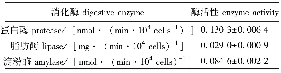 消化酶 digestive enzyme酶活性 enzyme activity蛋白酶 protease/[nmol·(min·104 cells-1)]0.130 3±0.006 4脂肪酶 lipase/[mg·(min·104 cells)-1]0.029 0±0.000 9淀粉酶 amylase/[nmol·(min·104 cells)-1]0.084 6±0.002 2