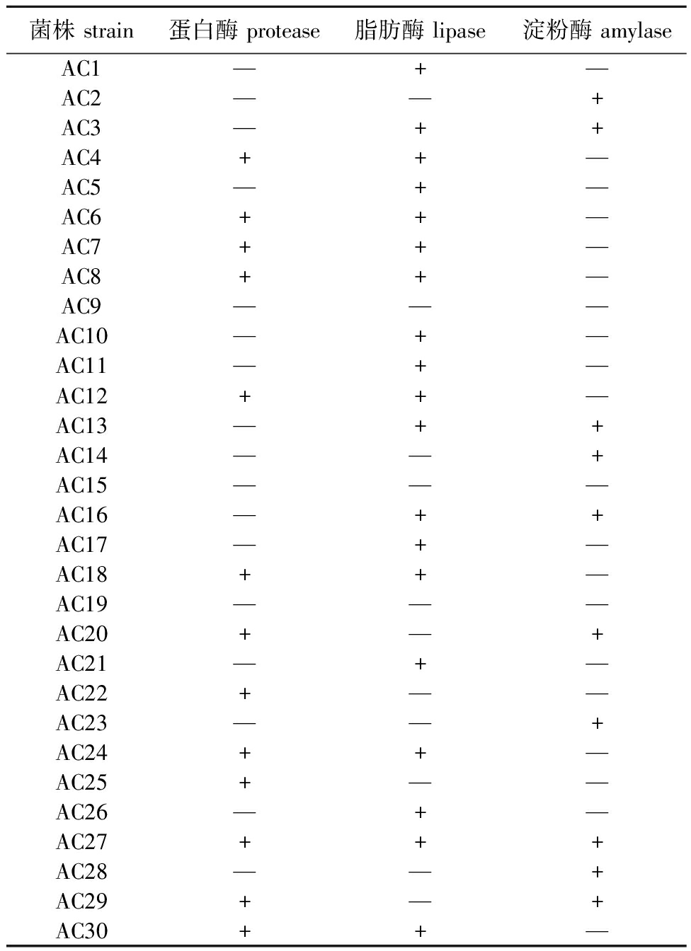 菌株 strain蛋白酶 protease脂肪酶 lipase淀粉酶 amylaseAC1—+—AC2——+AC3—++AC4++—AC5—+—AC6++—AC7++—AC8++—AC9———AC10—+—AC11—+—AC12++—AC13—++AC14——+AC15———AC16—++AC17—+—AC18++—AC19———AC20+—+AC21—+—AC22+——AC23——+AC24++—AC25+——AC26—+—AC27+++AC28——+AC29+—+AC30++—