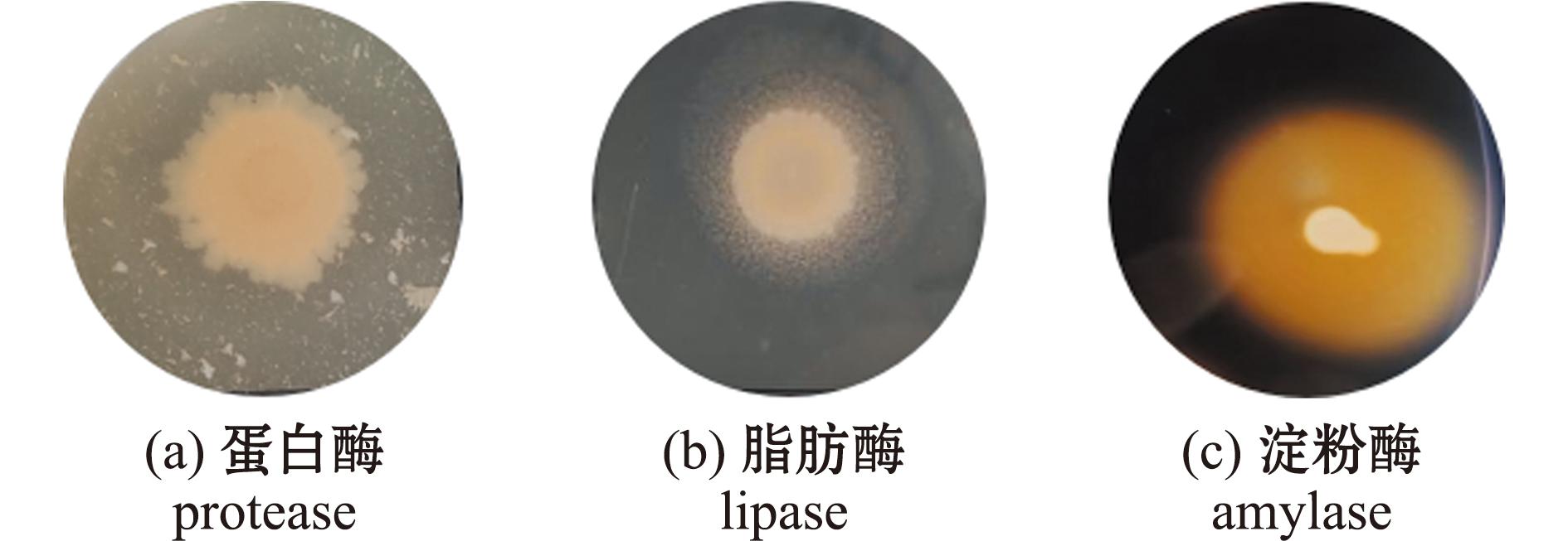 对这30株细菌进行产酶能力检测,结果见表1,13株产蛋白酶,19株产脂肪酶,10株产淀粉酶,3株未检测出产酶能力,其中仅有1株菌同时产3种酶,14株菌产两种酶,12株菌产1种酶,根据产酶能力选择产3种酶的菌株(记为AC27)进行后续试验,其产酶结果如图2所示。