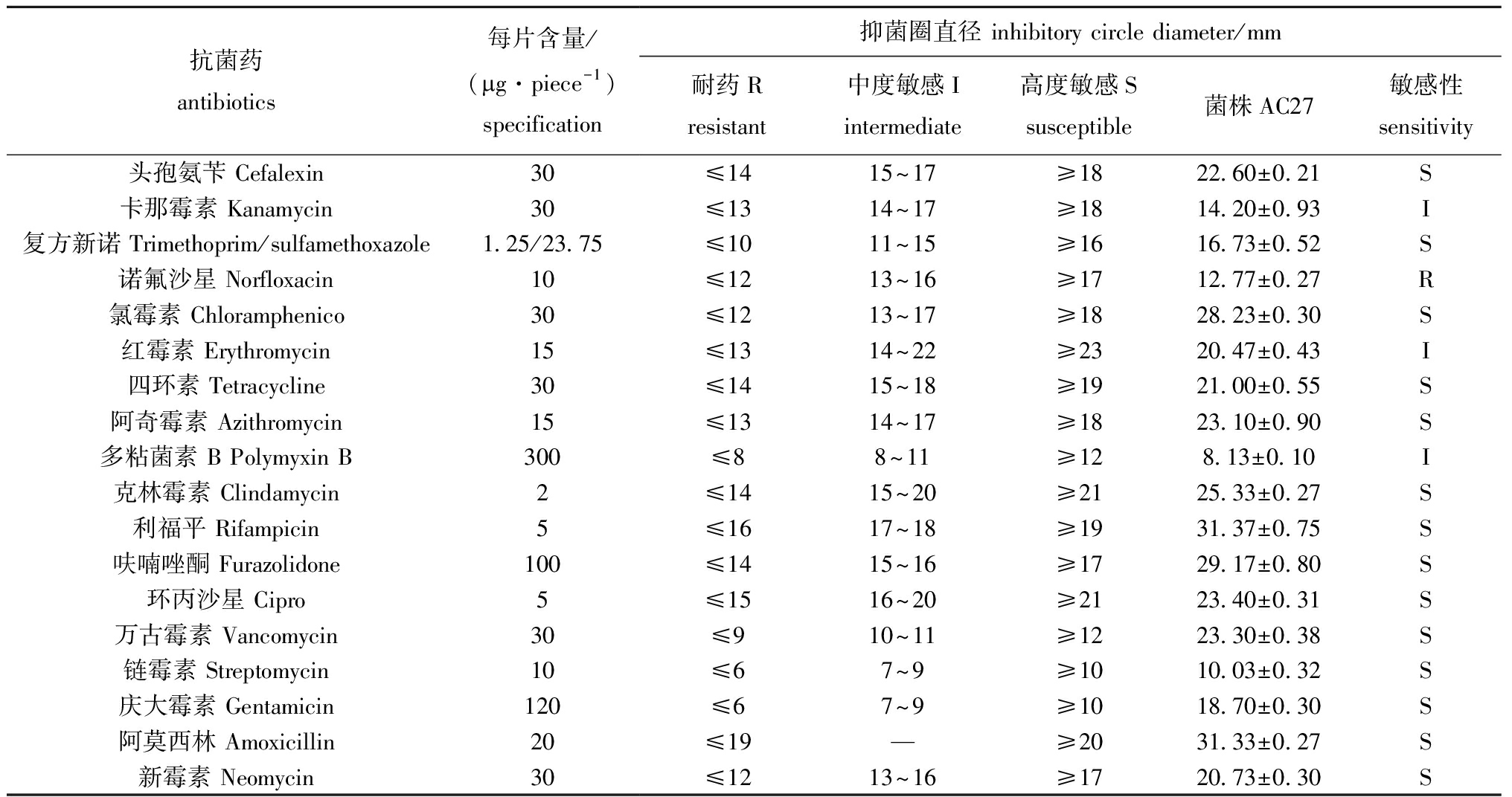 表3 菌株AC27药敏试验结果