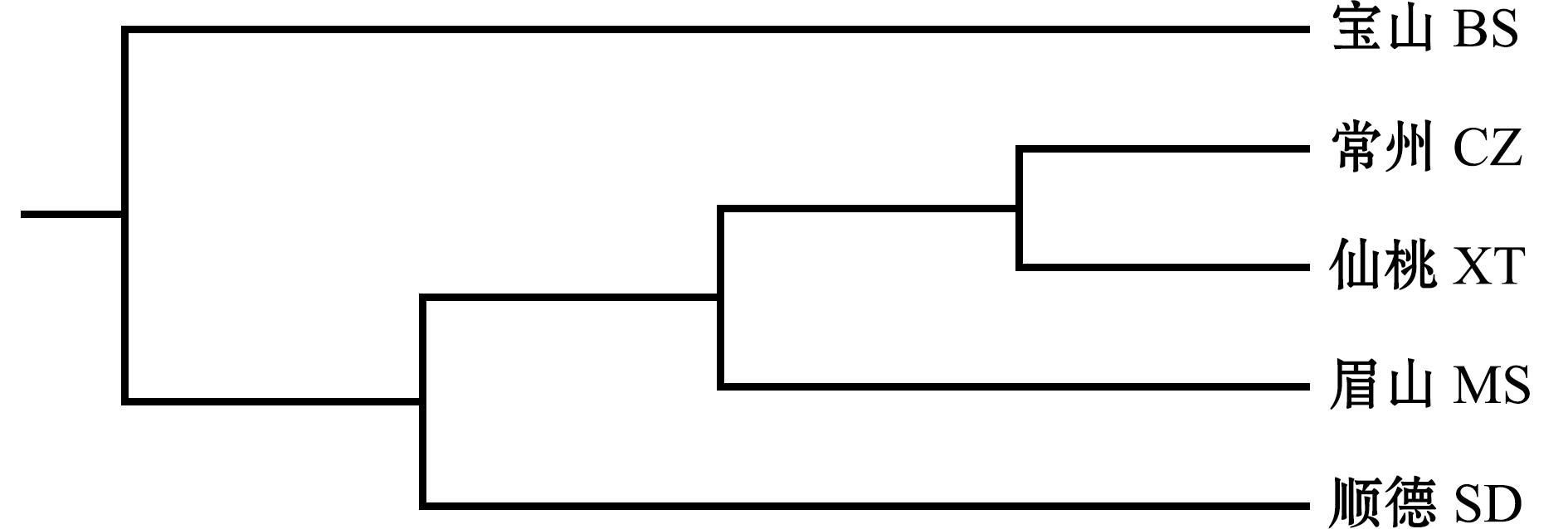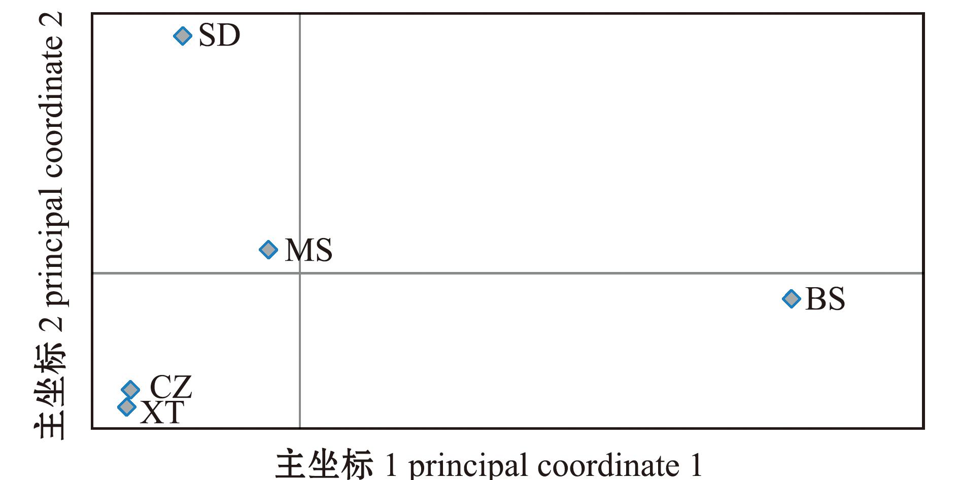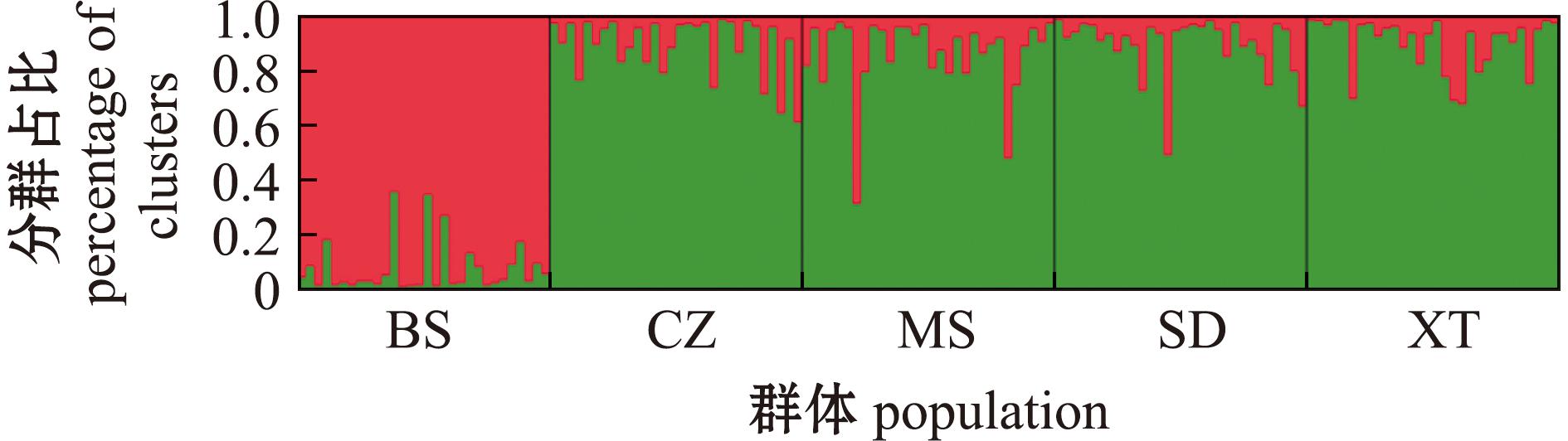 基于Nei’s遗传距离的UPGMA聚类分析结果(图1)显示,CZ群体先与和XT群体聚为一支,然后与MS群体聚为一支,再与SD群体聚为一支,最后与BS群体聚为一支,表明BS群体与其他地理群体遗传关系相对较远。