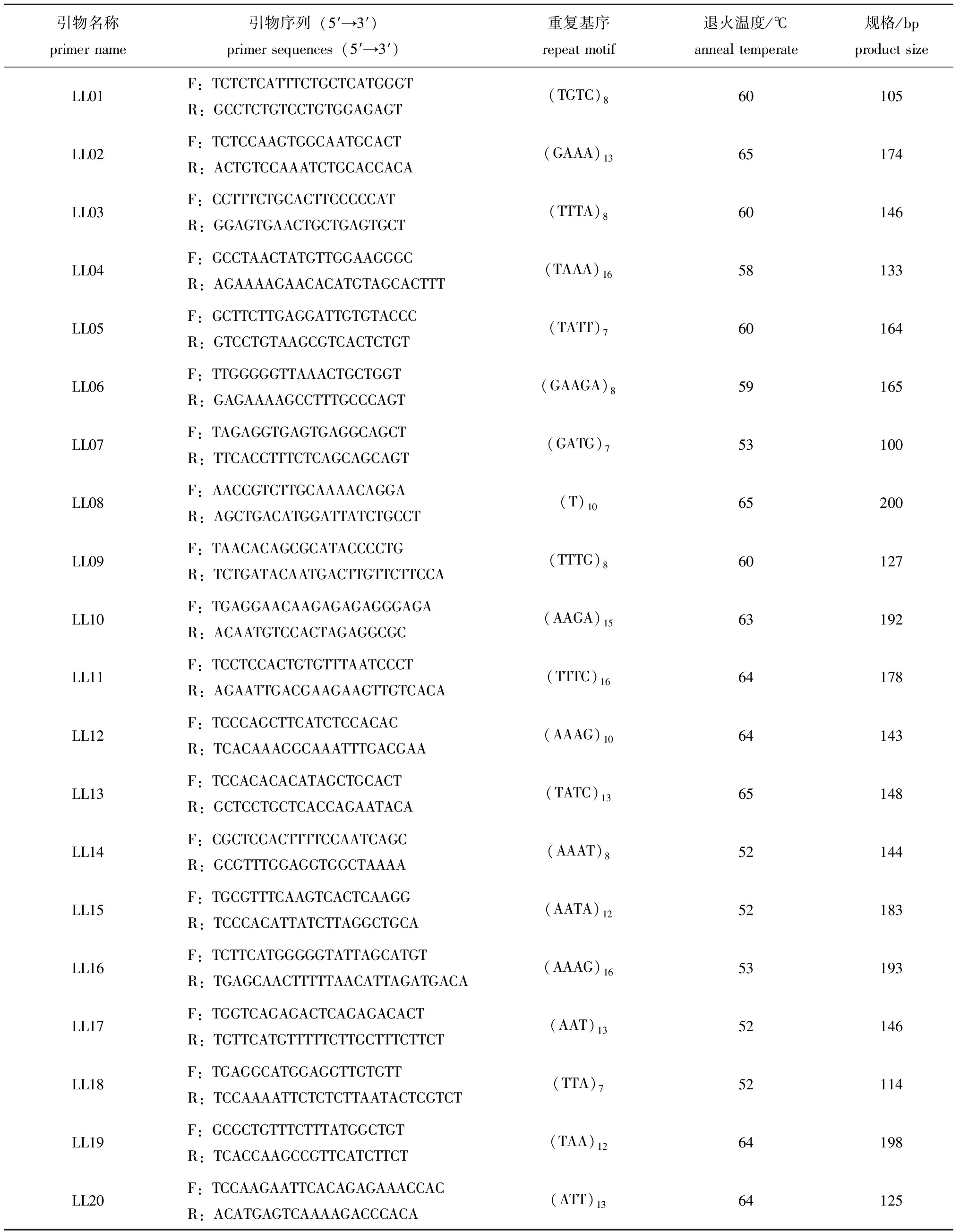 引物名称primer name引物序列(5′→3′) primer sequences(5′→3′) 重复基序repeat motif退火温度/℃anneal temperate规格/bpproduct sizeLL01F:TCTCTCATTTCTGCTCATGGGTR:GCCTCTGTCCTGTGGAGAGT(TGTC)860105LL02F:TCTCCAAGTGGCAATGCACTR:ACTGTCCAAATCTGCACCACA(GAAA)1365174LL03F:CCTTTCTGCACTTCCCCCATR:GGAGTGAACTGCTGAGTGCT(TTTA)860146LL04F:GCCTAACTATGTTGGAAGGGCR:AGAAAAGAACACATGTAGCACTTT(TAAA)1658133LL05F:GCTTCTTGAGGATTGTGTACCCR:GTCCTGTAAGCGTCACTCTGT(TATT)760164LL06F:TTGGGGGTTAAACTGCTGGTR:GAGAAAAGCCTTTGCCCAGT(GAAGA)859165LL07F:TAGAGGTGAGTGAGGCAGCTR:TTCACCTTTCTCAGCAGCAGT(GATG)753100LL08F:AACCGTCTTGCAAAACAGGAR:AGCTGACATGGATTATCTGCCT(T)1065200LL09F:TAACACAGCGCATACCCCTGR:TCTGATACAATGACTTGTTCTTCCA(TTTG)860127LL10F:TGAGGAACAAGAGAGAGGGAGAR:ACAATGTCCACTAGAGGCGC(AAGA)1563192LL11F:TCCTCCACTGTGTTTAATCCCTR:AGAATTGACGAAGAAGTTGTCACA(TTTC)1664178LL12F:TCCCAGCTTCATCTCCACACR:TCACAAAGGCAAATTTGACGAA(AAAG)1064143LL13F:TCCACACACATAGCTGCACTR:GCTCCTGCTCACCAGAATACA(TATC)1365148LL14F:CGCTCCACTTTTCCAATCAGCR:GCGTTTGGAGGTGGCTAAAA(AAAT)852144LL15F:TGCGTTTCAAGTCACTCAAGGR:TCCCACATTATCTTAGGCTGCA(AATA)1252183LL16F:TCTTCATGGGGGTATTAGCATGTR:TGAGCAACTTTTTAACATTAGATGACA(AAAG)1653193LL17F:TGGTCAGAGACTCAGAGACACTR:TGTTCATGTTTTTCTTGCTTTCTTCT(AAT)1352146LL18F:TGAGGCATGGAGGTTGTGTTR:TCCAAAATTCTCTCTTAATACTCGTCT(TTA)752114LL19F:GCGCTGTTTCTTTATGGCTGTR:TCACCAAGCCGTTCATCTTCT(TAA)1264198LL20F:TCCAAGAATTCACAGAGAAACCACR:ACATGAGTCAAAAGACCCACA(ATT)1364125