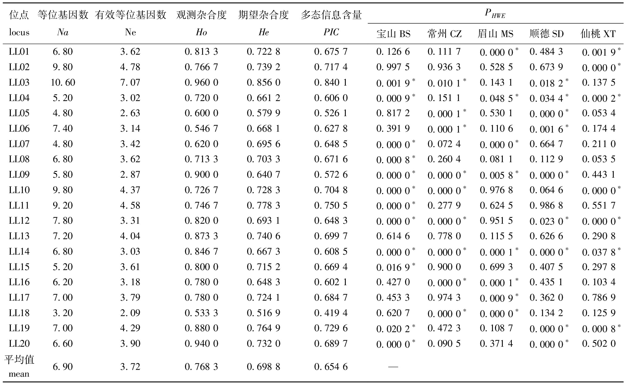 位点locus等位基因数Na有效等位基因数Ne观测杂合度Ho期望杂合度He多态信息含量PICPHWE宝山BS常州CZ眉山MS顺德SD仙桃XTLL016.803.620.813 30.722 80.675 70.126 60.111 7 0.000 0∗0.484 3 0.001 9∗LL029.804.780.766 70.739 20.717 40.997 50.936 30.528 50.673 90.000 0∗LL0310.607.070.960 00.856 00.840 10.001 9∗0.010 1∗0.143 10.018 2∗0.137 5LL045.203.020.720 00.661 20.606 00.000 9∗0.151 10.048 5∗0.034 4∗0.000 2∗LL054.802.630.600 00.579 90.526 10.817 20.000 1∗0.530 10.000 0∗0.053 4LL067.403.140.546 70.668 10.627 80.391 90.000 1∗0.110 60.001 6∗0.174 4LL074.803.420.620 00.695 60.648 50.000 0∗0.072 40.000 0∗0.664 70.211 0LL086.803.620.713 30.703 30.671 60.000 8∗0.260 40.081 10.112 90.053 5LL095.802.870.900 00.640 70.572 60.000 0∗0.000 0∗0.005 8∗0.000 0∗0.443 1LL109.804.370.726 70.728 30.704 80.000 0∗0.000 0∗0.976 80.064 60.000 0∗LL119.204.580.746 70.778 30.750 50.000 0∗0.277 90.624 50.986 80.551 7LL127.803.310.820 00.693 10.648 30.000 0∗0.000 0∗0.951 50.023 0∗0.000 0∗LL137.204.040.873 30.740 60.699 70.614 60.778 00.115 50.626 60.290 8LL146.803.030.846 70.667 30.608 50.000 0∗0.000 0∗0.000 1∗0.000 0∗0.037 8∗LL155.203.610.800 00.715 20.669 40.016 9∗0.900 00.699 30.407 50.297 8LL166.203.180.780 00.648 30.602 10.427 00.000 0∗0.000 1∗0.435 10.103 4LL177.003.790.780 00.724 10.684 70.453 30.974 30.000 9∗0.362 00.786 9LL183.202.090.533 30.516 90.419 40.620 70.000 0∗0.000 0∗0.134 20.125 9LL197.004.290.880 00.764 90.729 60.020 2∗0.472 30.108 70.000 0∗0.000 8∗LL206.603.900.940 00.732 00.689 70.000 0∗0.090 50.371 40.000 0∗0.502 0平均值 mean6.903.720.768 30.698 80.654 6—