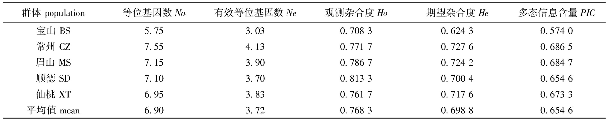 群体 population等位基因数Na有效等位基因数Ne观测杂合度Ho期望杂合度He多态信息含量PIC宝山 BS5.753.030.708 30.624 30.574 0常州 CZ7.554.130.771 70.727 60.686 5眉山 MS7.153.900.786 70.724 20.684 7顺德 SD7.103.700.813 30.700 40.654 6仙桃 XT6.953.830.761 70.717 60.673 3平均值 mean6.903.720.768 30.698 80.654 6