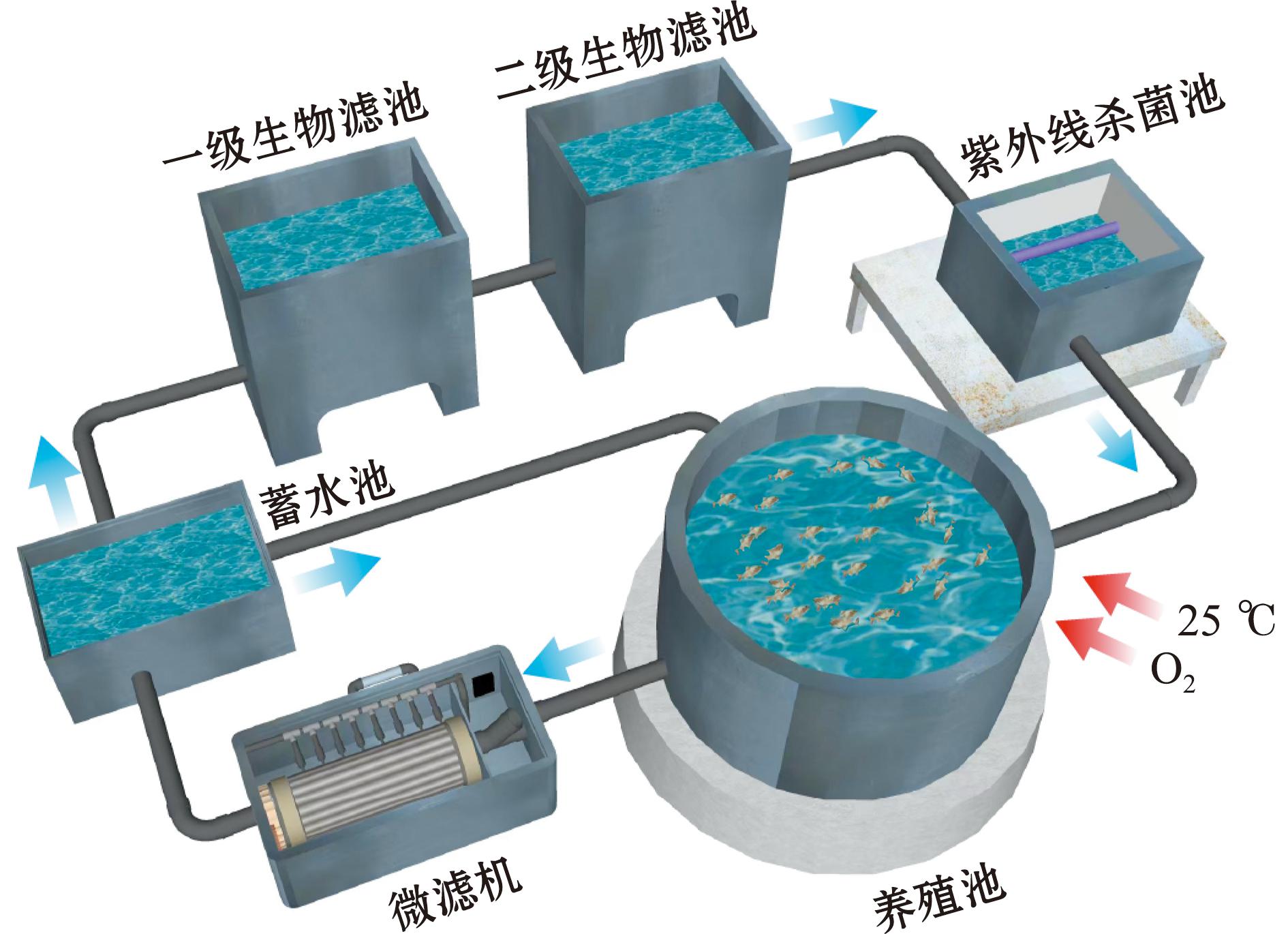随着水产养殖业的快速发展,环境保护与养殖之间的矛盾愈发突出,合理利用水资源已成为一个亟待解决的热点问题,人们对绿色可持续新型水产养殖系统的需求日益迫切。循环水养殖系统(recirculating aquaculture system,RAS)是一种通过人工调控技术手段,在封闭或半封闭环境中实现水资源循环利用的绿色养殖系统。RAS水处理环节可以有效去除悬浮物、氨氮、亚硝酸盐等有害物质[1],水质调控模块可以精确控制水温、溶解氧(DO)等环境参数,为养殖动物创造了最适宜的生长条件。与传统的粗放型养殖方式相比,RAS不仅显著提高了养殖效率与产量,还降低了养殖动物疾病发生的风险,且对环境无负面影响[2-4]。由于其高效、安全和可持续的特点,RAS在国内水产企业中的应用正不断增加。