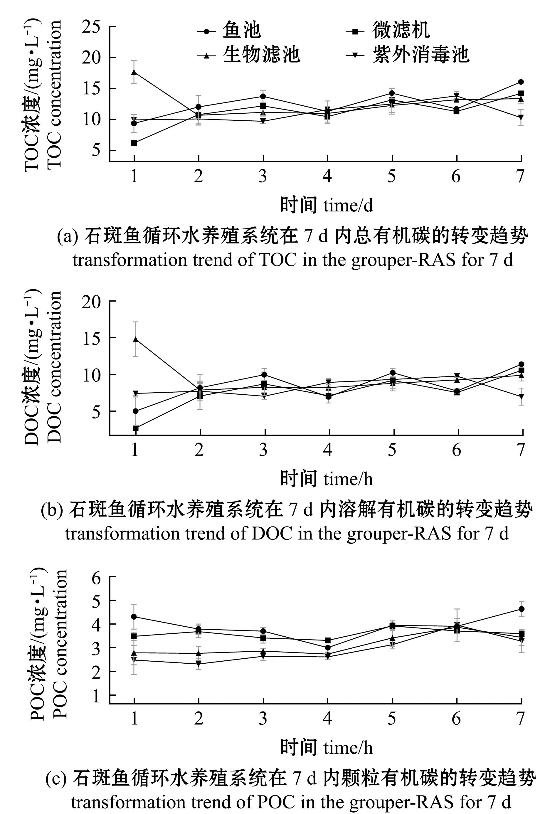 在长周期(7 d)试验中,系统4个单元内POC、DOC和TOC含量随着时间延长呈现出特定变化(图3)。试验初期,各单元内碳元素含量依次为鱼池>微滤机>生物滤池>紫外线消毒池;自试验第3 天开始,各单元内POC、DOC和TOC含量趋于平衡,此后保持相对稳定的浓度变化;至试验第7 天,各单元内碳元素浓度发生改变,鱼池内POC、DOC和TOC含量最高,而紫外线消毒池内POC、DOC和TOC含量最低。整个周期内,各单元的碳元素含量始终保持波动平衡状态。