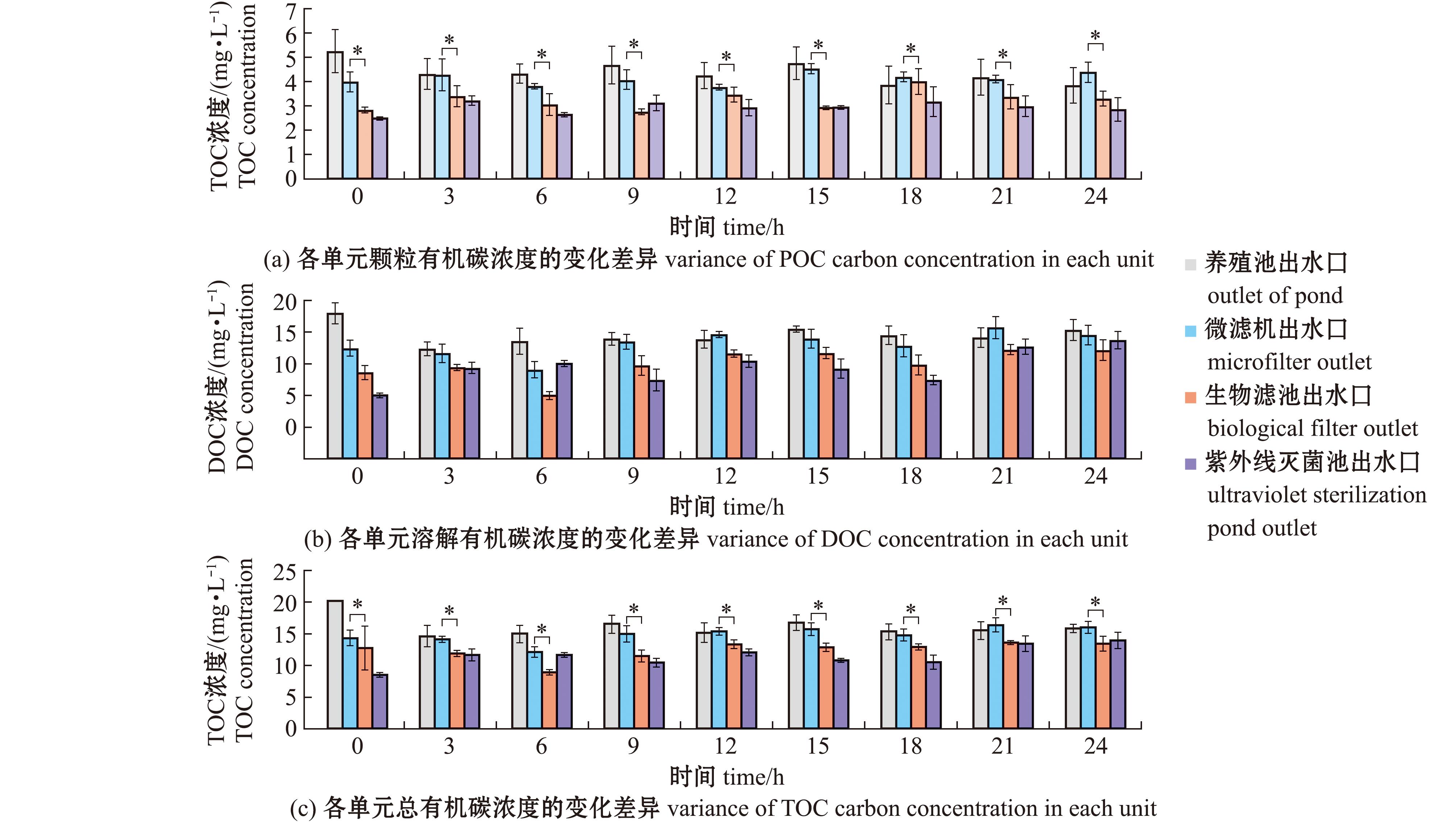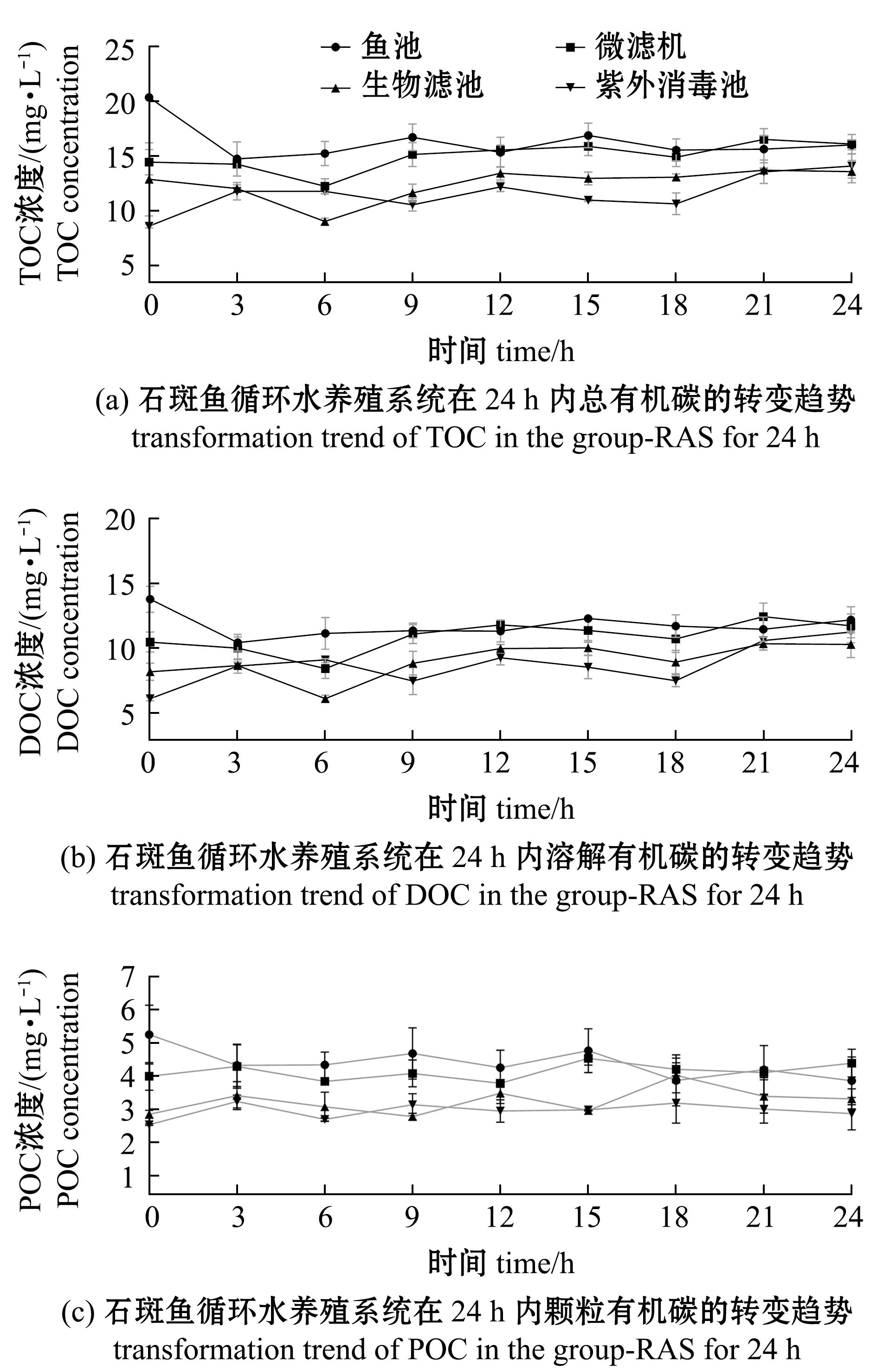 1.2.2 养殖水样品 试验期间,于每日9:00及第3 天投喂后的0、3、6、9、12、15、18、21、24 h,分别采集系统各处理单元出水口水样,每次取10 mL水样,经WhatmanGF/F玻璃纤维膜(450 ℃灼烧)过滤后,使用TOC分析仪测定水体DOC含量;将滤膜干燥后,使用元素分析仪测定水体POC含量。