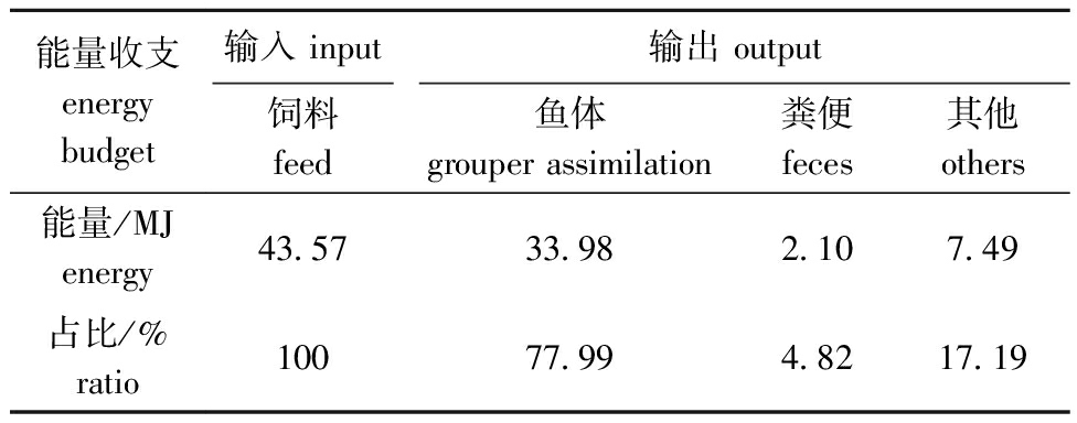 能量收支energy budget输入 input输出 output饲料feed鱼体grouper assimilation粪便feces其他others能量/MJenergy43.5733.982.107.49占比/%ratio10077.994.8217.19