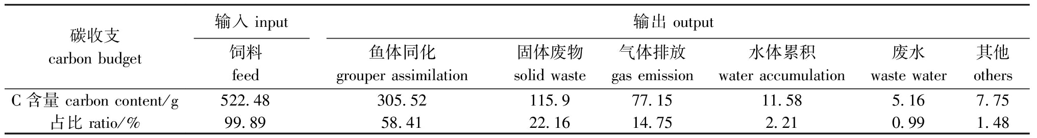 碳收支carbon budget输入 input输出 output饲料feed鱼体同化grouper assimilation固体废物solid waste气体排放gas emission水体累积water accumulation废水waste water其他othersC含量 carbon content/g522.48305.52115.977.1511.585.167.75占比 ratio/%99.8958.4122.1614.752.210.991.48