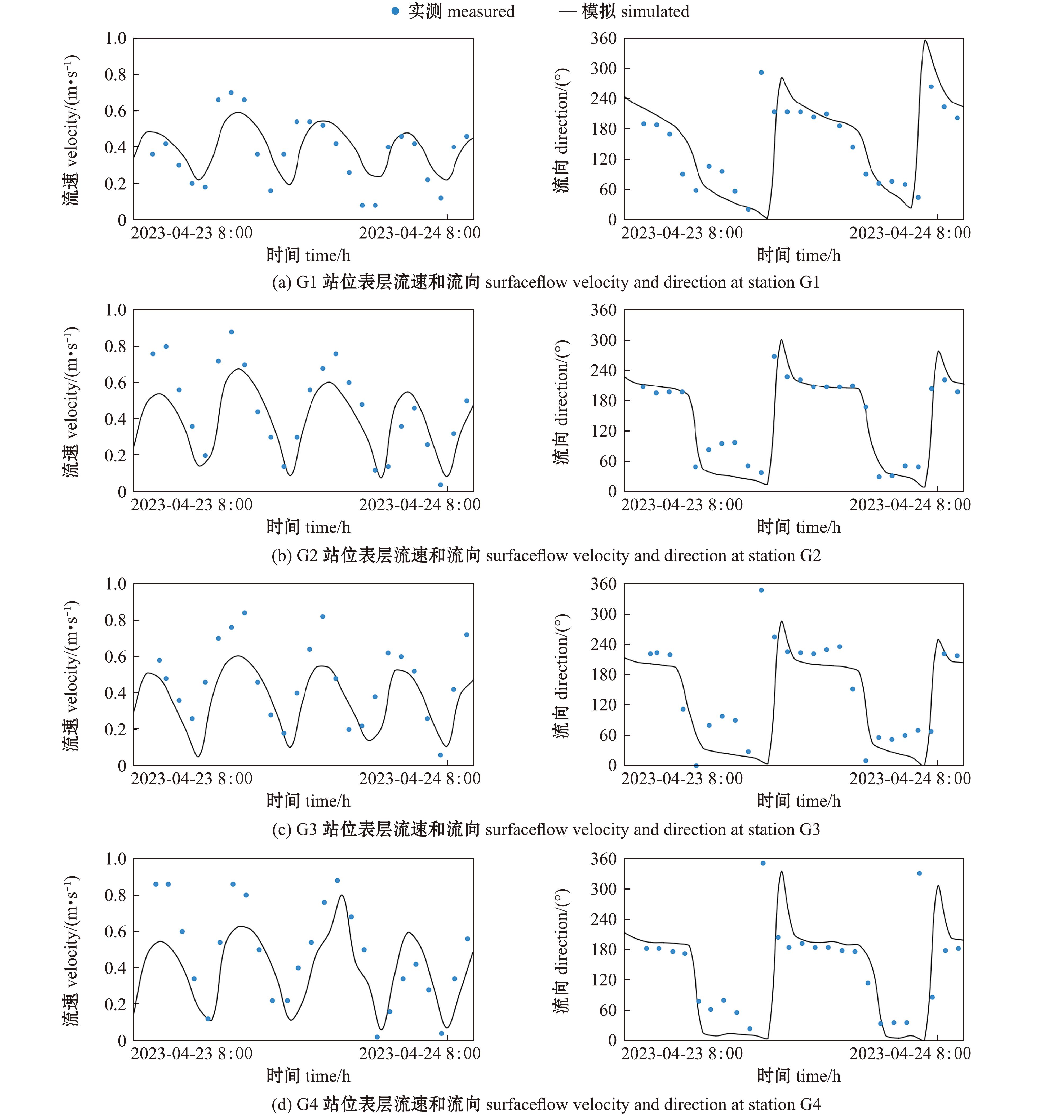 为了确保三维水动力模型的准确性,本研究使用鲅鱼圈和葫芦岛潮位站实测数据(2023年5月)、G1~G4潮流测站的潮流实测数据(2023年4月23日—4月24日)对模型模拟结果进行验证,各测站具体位置如图1B所示。图2展示了两个潮位测站的实测数据与模拟结果的对比,结果表明,这两个测站的潮汐均为不规则半日潮,鲅鱼圈和葫芦岛的水位模拟值与实测值的均方根误差(RMSE)分别为0.226 4、0.236 5 m,误差较小。图3重点展示了G1~G4 4个潮流监测站大潮期间的表层流速及流向的模拟结果与实测数据对比(因图幅限制,中层与底层数据未予图示)。数据显示,所有测站的模拟值与实测值基本一致,其中最大流速出现在G4测站表层落急时刻,达0.798 m/s,且垂向分布呈现表层>中层>底层的典型特征。水动力模型较好地复现了辽东湾北部海域的运动特征,能为后续的水动力及生态环境变化研究提供科学依据和数据支持。