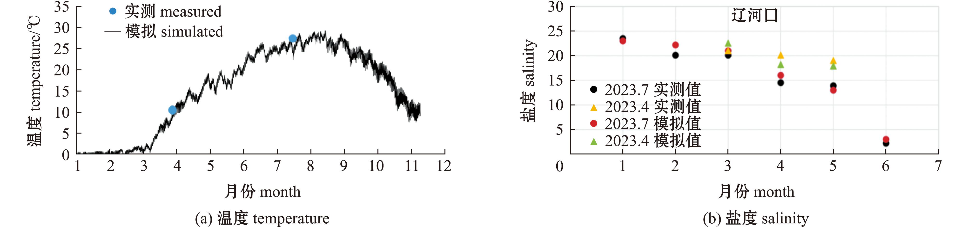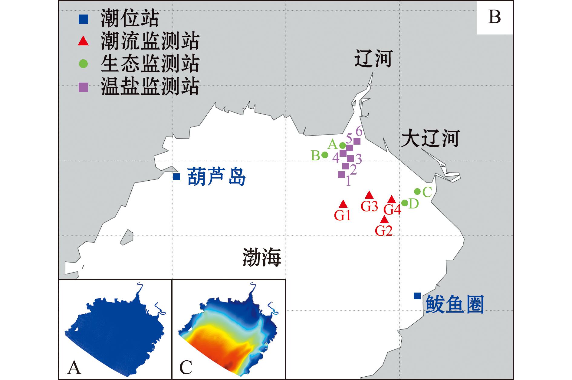 1.2.3 模型参数设置 网格水平方向网格数为394×383,网格空间分辨率为150~600 m,并且对辽河、大辽河的河道及河口区域进行了网格细化(图1A),垂向使用σ坐标,分为6层。计算域的开边界条件采用了全球海洋潮汐模型提供的数据,闭边界设置为无渗透滑移边界条件。辽河和大辽河盘锦段设为河流开边界,上游河流的边界条件基于实测的河流入海流量。海洋开边界的温盐数据源自ERA5全球再分析数据集,叶绿素a和溶解氧数据参考了文献[15-16]。河流开边界的温盐、叶绿素a、溶解氧和营养盐浓度均来自实测数据的月平均值。研究中涉及大气的热交换,大气强迫数据来自ERA5全球再分析数据集,涵盖湿度、热通量和太阳辐射等。水动力模型时间步长设为1 min,模拟时间为2022年11月1日—2023年11月1日。