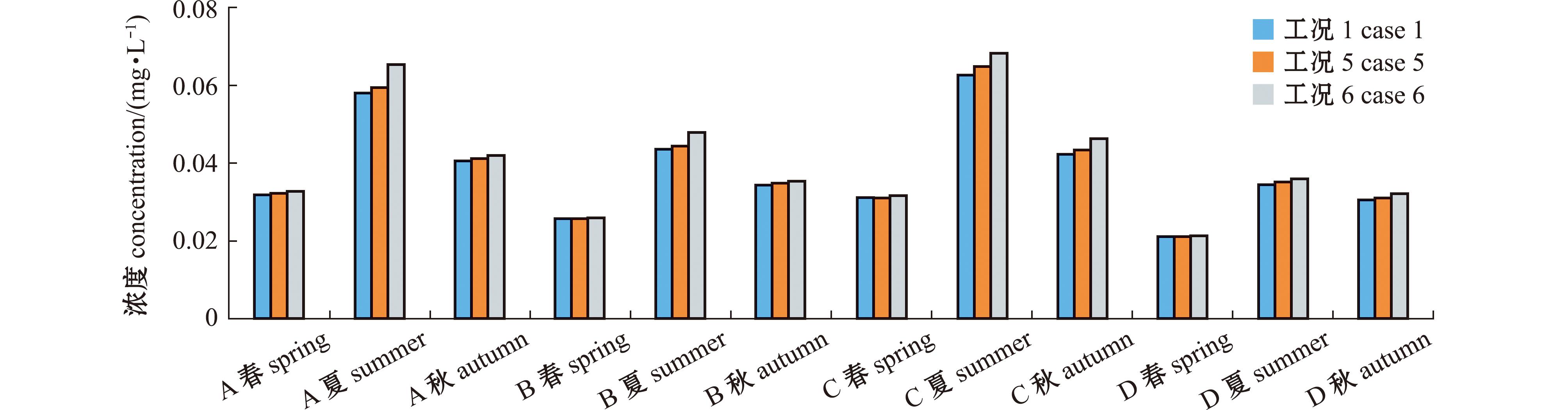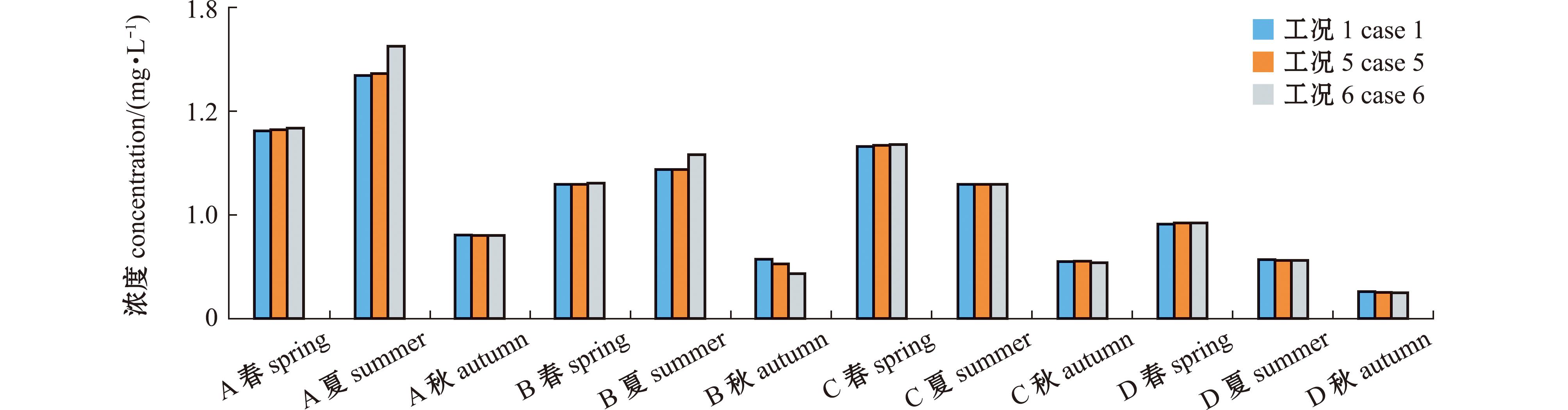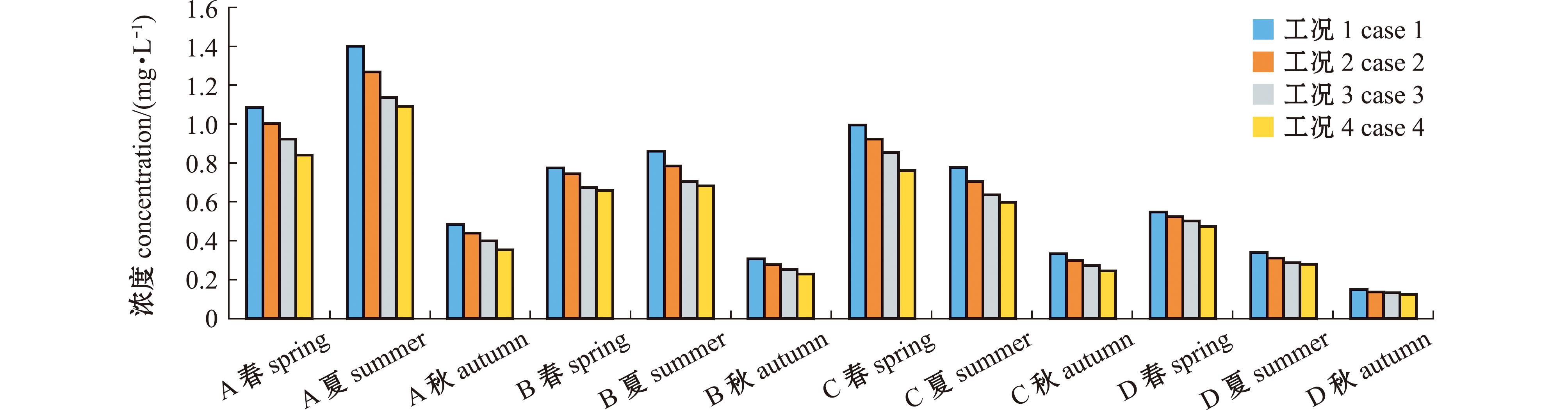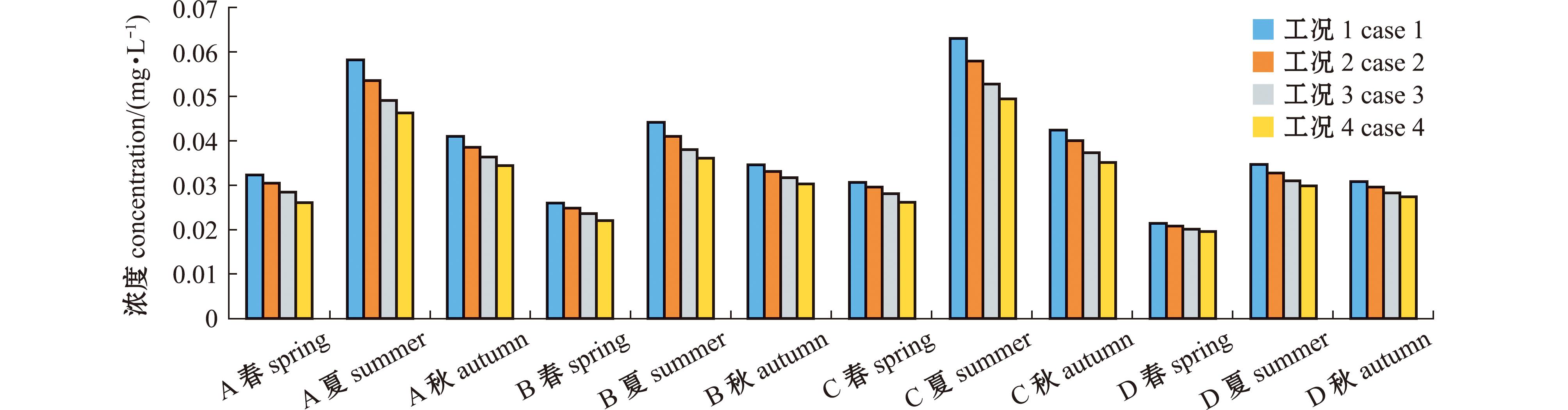 图7和图8给出了不同削减工况下的无机氮和无机磷浓度模拟结果,在工况2条件下(污染物10%削减),各点无机氮浓度在春季降低为4.21%~7.28%,在夏季降低为7.35%~9.62%,在秋季降低为6.91%~9.09%。污染物削减10%后,水质改善效果有限,除C、B两点秋季由Ⅲ类变为Ⅱ类水体外,大部分点位依旧维持在原有类别。在工况3中(污染物20%削减),无机氮浓度降低幅度在春季为8.75%~15.14%,在夏季降低为14.79%~18.93%,在秋季降低为14.00%~18.13%。4个点水质情况与工况2相比有了明显的改善。工况4条件下(污染物20%削减),无机氮浓度较工况3进一步下降(春季为14.00%~23.48%,夏季为16.87%~22.91%,秋季为19.37%~26.84%),4个点水质改善效果明显。