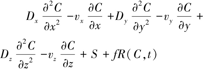 式中:t为时间(s);C为物质浓度(kg·m-3);Dx、Dy和Dz分别为3个坐标方向上的扩散系数(m2·s-1);vx、vy和vz分别为3个方向上的速度(m·s-1);S为物质输入源项;fR(C,t)为物质反应项,包括了溶解氧、叶绿素a、硝酸盐氮、氨氮、活性磷酸盐5个子系统,其对应表达式见文献[11,14]。