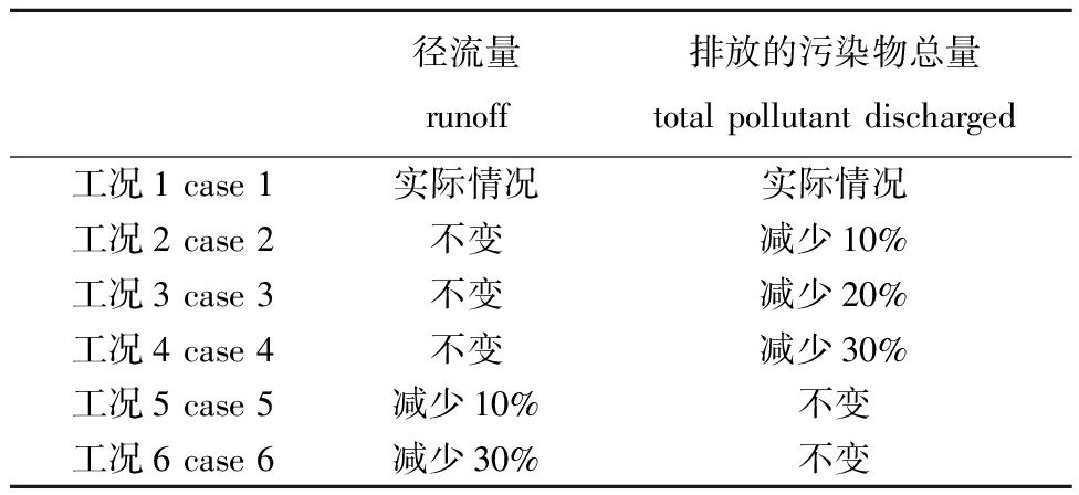 径流量runoff排放的污染物总量total pollutant discharged工况1 case 1实际情况实际情况工况2 case 2不变减少10%工况3 case 3不变减少20%工况4 case 4不变减少30%工况5 case 5减少10%不变工况6 case 6减少30%不变