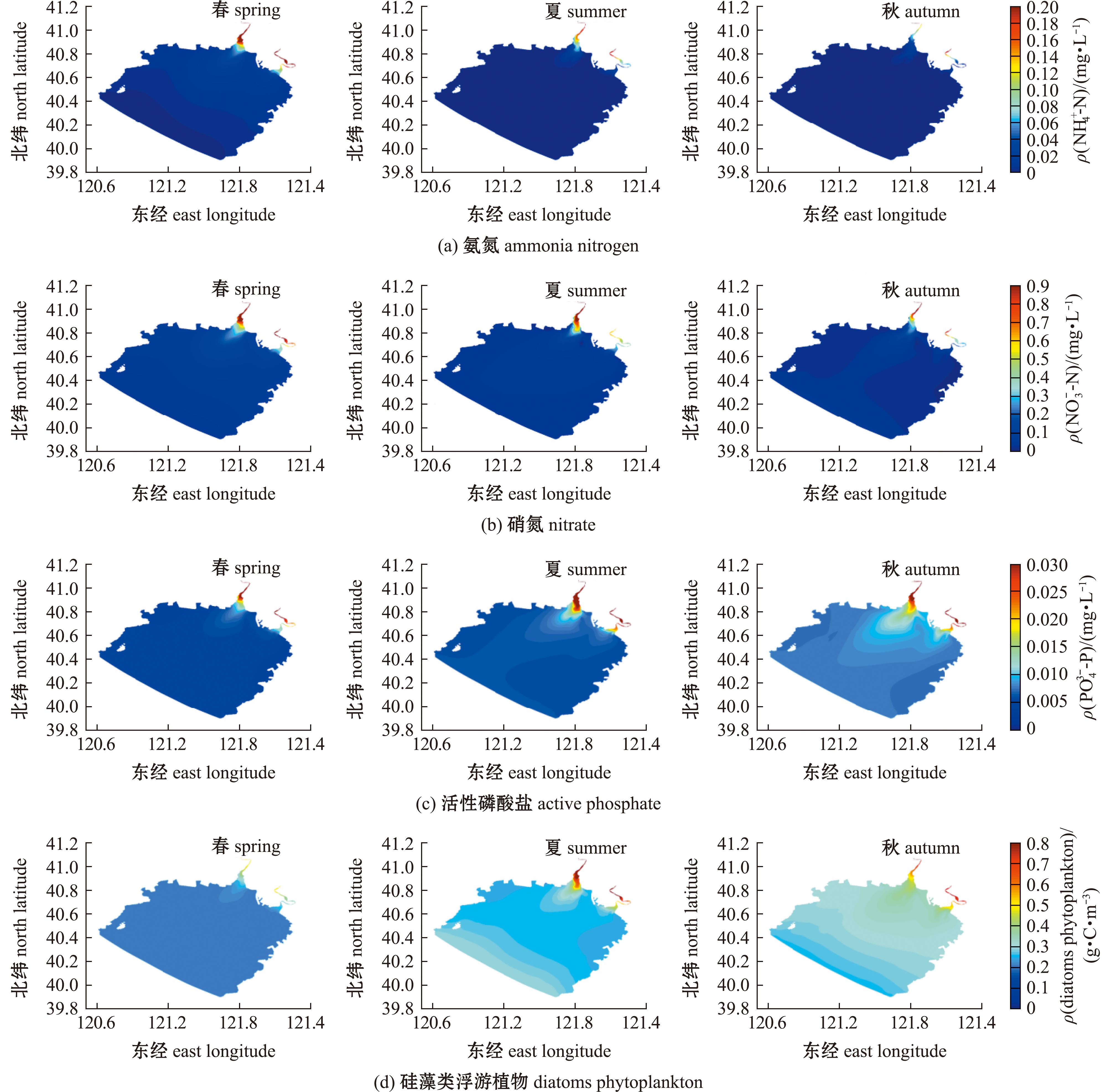 图6为辽东湾北部海域3个季节(春、夏、秋)的氮磷营养盐及硅藻类浮游植物的空间分布情况。从季节变化来看,研究水域中氨氮、硝酸盐的平均含量春季>夏季>秋季(图6(a),(b)),主要原因是辽河和大辽河在冬季和春季入海污染物的持续输入,冰封致使水交换减弱,导致该海域无机氮累积。此外,春季浮游植物对氮磷营养盐消耗较少,导致2023年春季无机氮超标严重,夏季降雨和径流量达到高峰,无机氮输入增强,但因水温升高,湾顶处浮游植物大量繁殖(图6(d)),对氮元素的消耗显著,导致夏季无机氮浓度低于春季。而磷酸盐、硅藻类浮游植物含量呈现秋季>夏季>春季。同时辽东湾东北部海域水深较浅,垂直梯度上各组分营养盐变化较小。