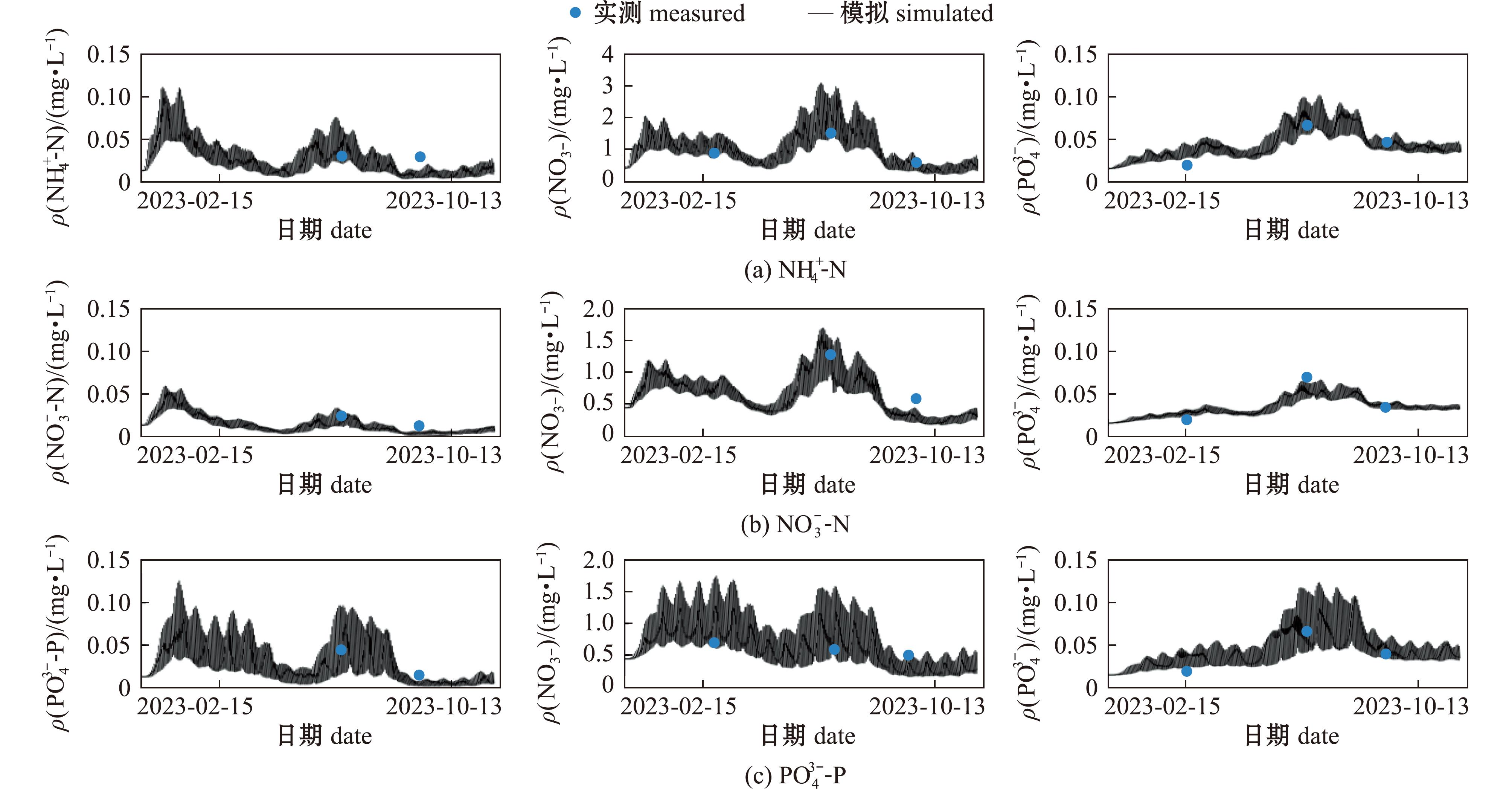 根据水质实测数据(2023年4月、7月和9月)对模拟结果进行验证,主要包括氨氮、硝酸盐、活性磷酸盐等生态指标浓度,测点分布见图1B。由于篇幅原因仅提供3个点位的模拟对比结果,具体如图5所示,水质变量的模拟值和实测数据吻合较好。氨氮和硝酸盐均呈现出春季(3月—4月)和夏季(7月—8月)的双峰特征,由于陆源输入使硝酸盐的浓度水平总体高于氨氮,同时由于浮游植物的快速生长,以及陆源输入、春季水体的混合和垂直通量增加导致春季氨氮、硝酸盐浓度的增加。与氨氮和硝酸盐浓度的双峰特征不同,活性磷酸盐浓度在夏季达到峰值,之后逐渐下降。相比之下,活性磷酸盐在春季的浓度上升幅度较小,未形成明显峰值。表明其在夏季的外源输入与内源释放占主导地位,而春季受到较少的影响,未形成显著峰值。模型对辽东湾海域水质变化的模拟结果与实测数据趋势吻合,能够反映辽东湾海域水体时空变化特征,尤其在氨氮、硝酸盐和活性磷酸盐等重要水质指标的变化方面表现出较高的准确性。