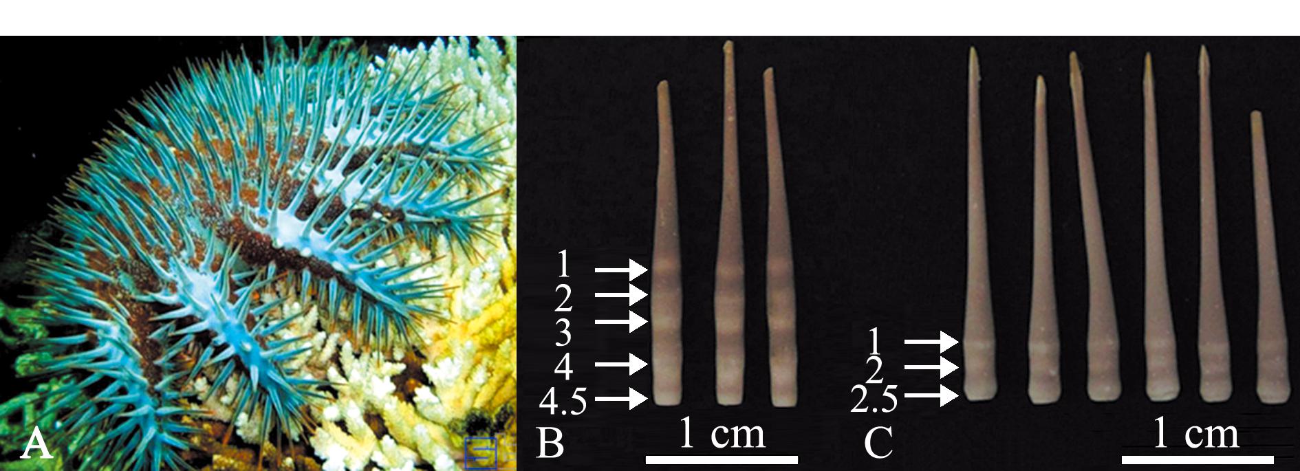 A—棘冠海星(Acanthaster planci);B,C—从两个海星中选择棘刺进行带状计数(显示出1~4.5和1~2.5的不同条带数)[46]。