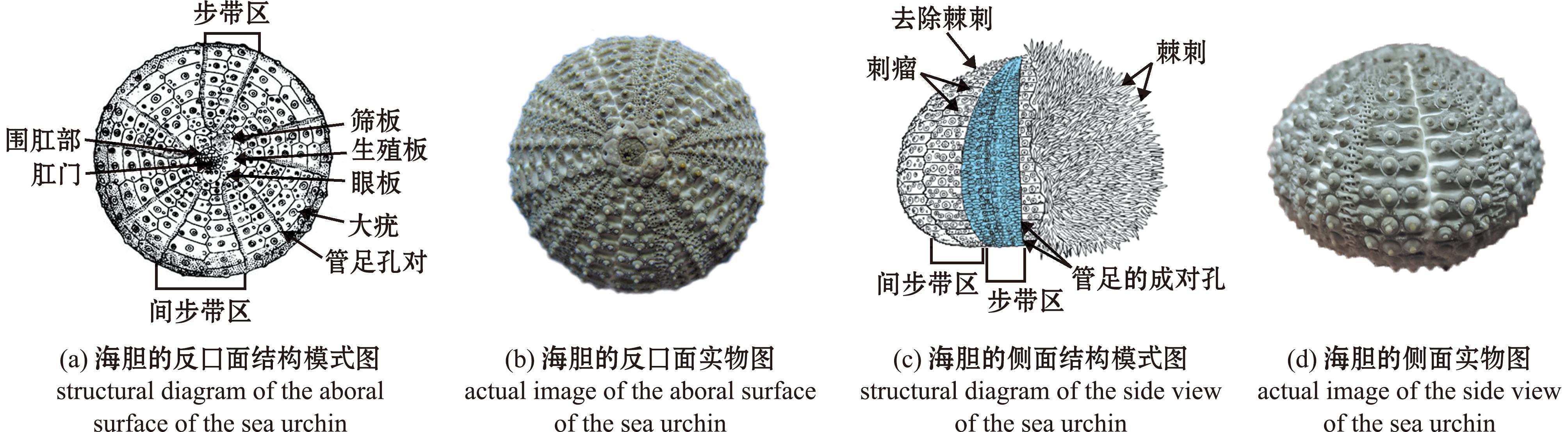 海胆类的骨骼由有序排列的碳酸钙骨片组成,可分为三大类:1)外部棘刺和棘刺基;2)步带与间步带(ambulacra and interambulacra)、顶系(apical system)(图2),包括围肛部(periproct)、5个生殖板(genital plates)和5个眼板(ocular plate);3)齿(亚里士多德提灯)。一般而言,海胆的鉴定方法大都基于这些硬组织开展。当海胆在春、夏季营养丰富的生长盛期时,硬组织生长速度较快,生长纹间隔较宽且透光性好(呈现亮带),而在秋、冬季营养匮乏,生长速度减缓时,硬组织的生长纹排列紧密(呈现暗带)。因此,大多硬组织其上或内部会呈现明暗相间的环纹,通常可以明暗交界处作为年龄标志。