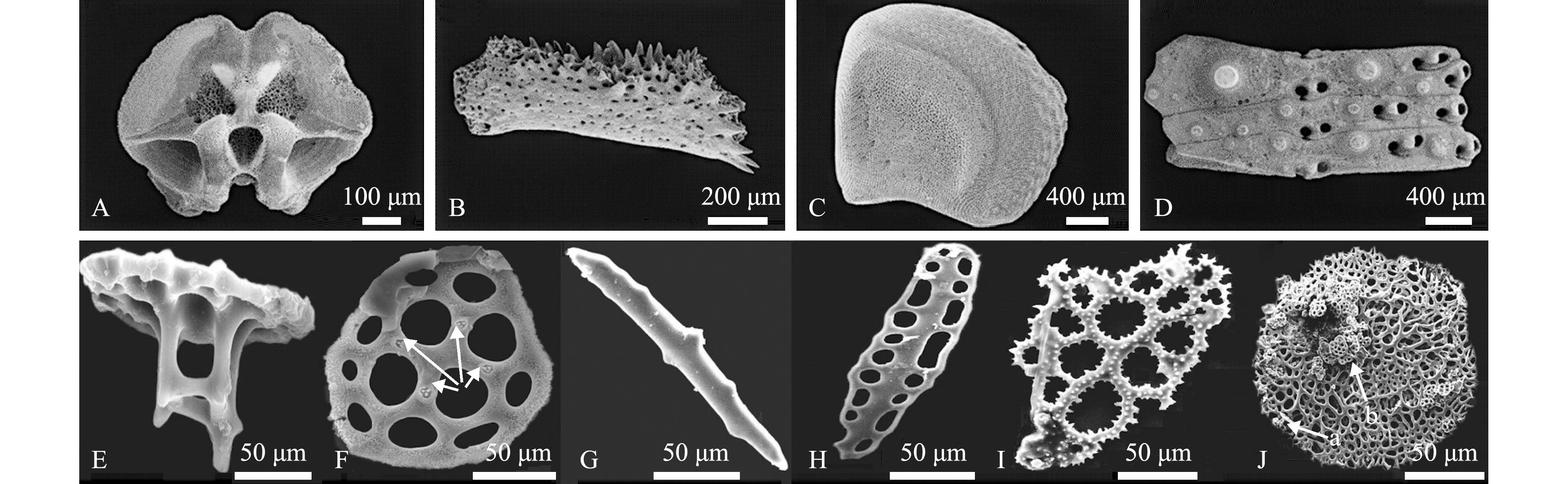 A—蛇尾纲(Ophiocoma echinata)的臂椎骨;B—海百合纲(Antedon mediterranea)的骨板;C—海星纲(Astropecten duplicatus)的外骨板;D—海胆纲(Tripneustes ventricosus)的步带板;E~J—分别为刺参(Apostichopus japonicus)的桌形体、扣形体、杆状体、长孔状体、花纹状体、复合盘状骨片。
