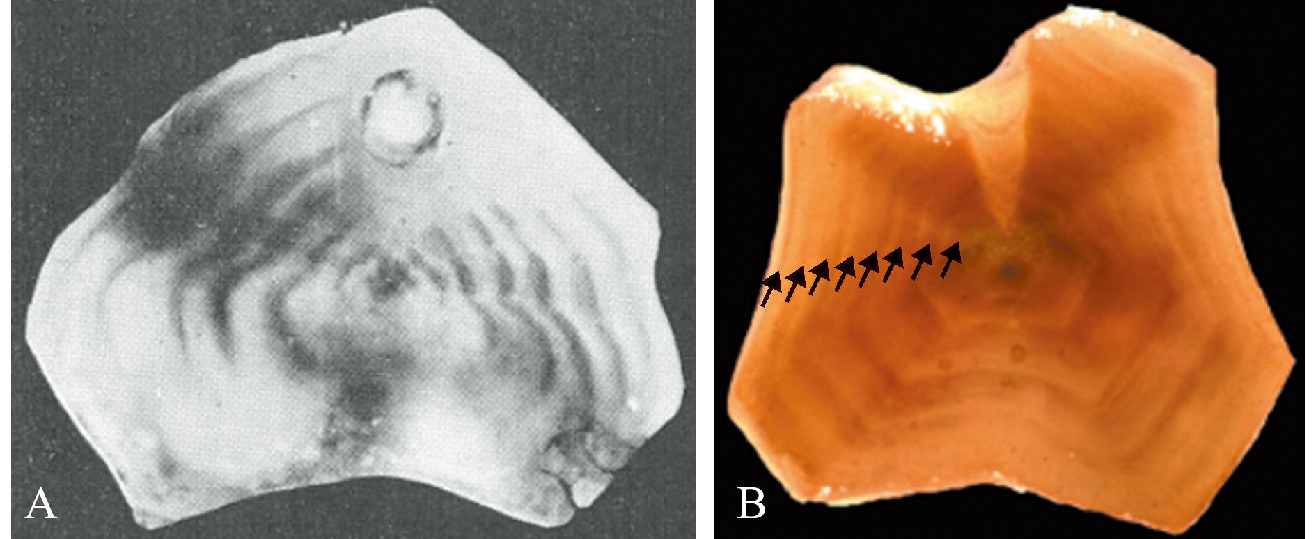 1926年,Deutler[38]提出,在大多数的海胆物种中,棘刺、步带板、间步带板、生殖板和齿的骨片上均有生长纹的存在,并用次氯酸钠溶液清洗、乙醇脱水、香脂包埋、研磨和抛光,然后用松油醇-甲基苯甲酸酯混合物(22∶1)浸泡,最后通过显微镜检观察的方法确认了生长纹的存在。1935年,Moore[39]使用二甲苯代替了松油醇-甲基苯甲酸酯混合物来使生殖板上的生长纹更明显(图3A)。1969年,Jensen[40]基于Moore的方法提出另一种方法,将生殖板在乙醇火焰中加热0.5~2 min直到生殖板变成深棕色,冷却后用二甲苯保存,观察到的生长纹更加明显,便于辨认估计年龄。至2018年,Balboa等[41]仍在使用硬组织法对智利海胆(Loxechinus albus)的生殖板上的生长纹进行观察,用于研究种群的生长模式,便于渔业管理政策的制定。