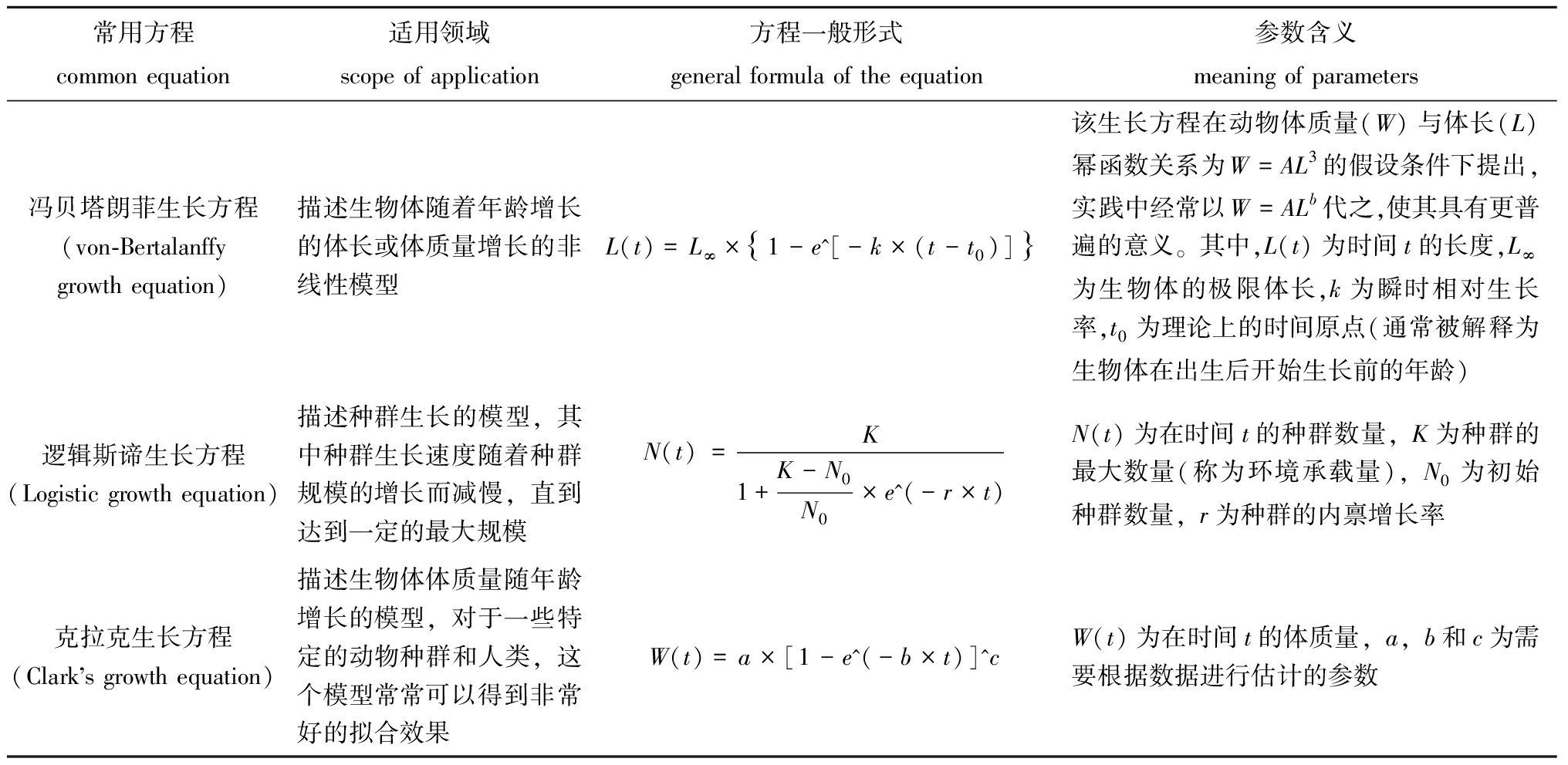 常用方程common equation适用领域scope of application方程一般形式general formula of the equation参数含义meaning of parameters冯贝塔朗菲生长方程(von-Bertalanffy growth equation)描述生物体随着年龄增长的体长或体质量增长的非线性模型L(t)=L∞×{1-e^[-k×(t-t0)]}该生长方程在动物体质量(W)与体长(L)幂函数关系为W=AL3的假设条件下提出,实践中经常以W=ALb代之,使其具有更普遍的意义。其中,L(t)为时间t的长度,L∞为生物体的极限体长,k为瞬时相对生长率,t0为理论上的时间原点(通常被解释为生物体在出生后开始生长前的年龄)逻辑斯谛生长方程(Logistic growth equation)描述种群生长的模型,其中种群生长速度随着种群规模的增长而减慢,直到达到一定的最大规模N(t)=K1+K-N0N0×e^(-r×t)N(t)为在时间t的种群数量,K为种群的最大数量(称为环境承载量),N0为初始种群数量,r为种群的内禀增长率克拉克生长方程(Clarks growth equation)描述生物体体质量随年龄增长的模型,对于一些特定的动物种群和人类,这个模型常常可以得到非常好的拟合效果W(t)=a×[1-e^(-b×t)]^cW(t)为在时间t的体质量,a,b和c为需要根据数据进行估计的参数
