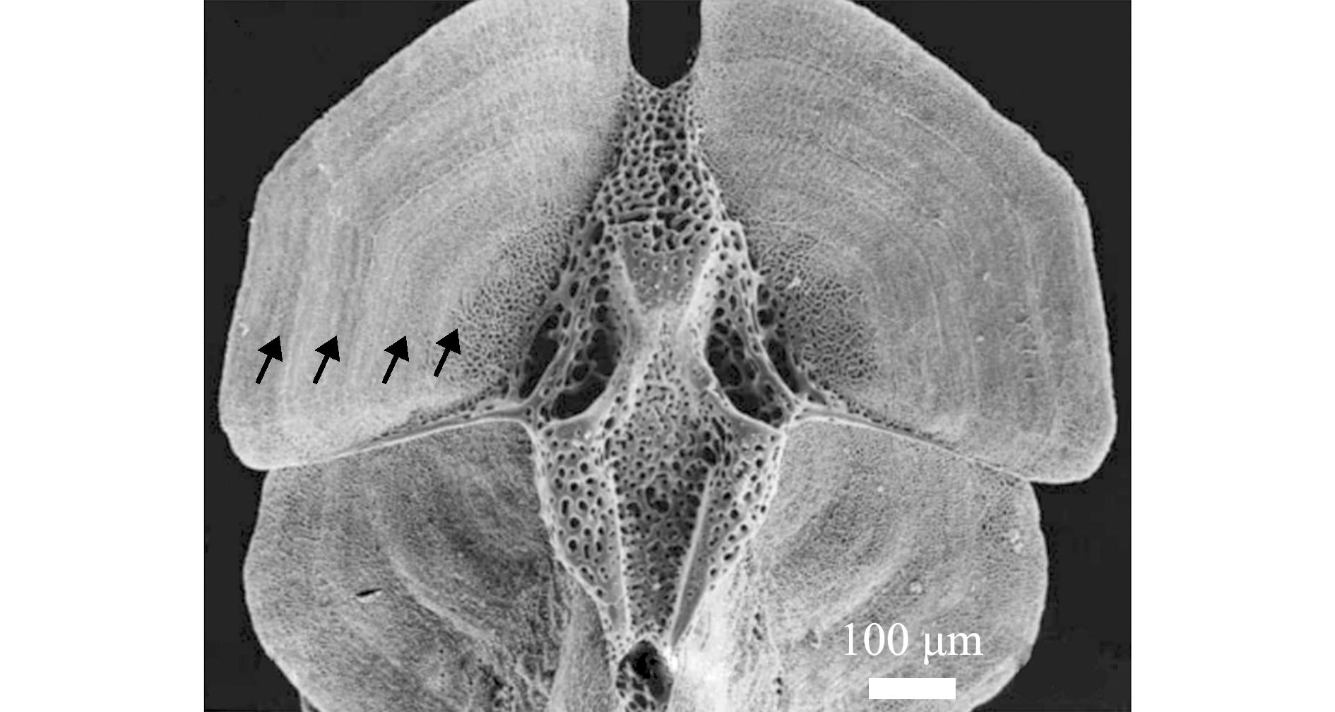 蛇尾纲动物年龄鉴定的主要硬组织是腕基部的椎骨(图7),即最靠近体盘边缘下的插入部分的骨骼。1998年,Dahm等[47]首次观察到海蛇尾腕基部的椎骨具有生长纹。2003年,Gage[48]通过扫描电镜观察蛇尾(Ophiocten gracilis)腕基部的椎骨生长纹以确定年龄,在所鉴定的样本个体中最大年龄为8龄。
