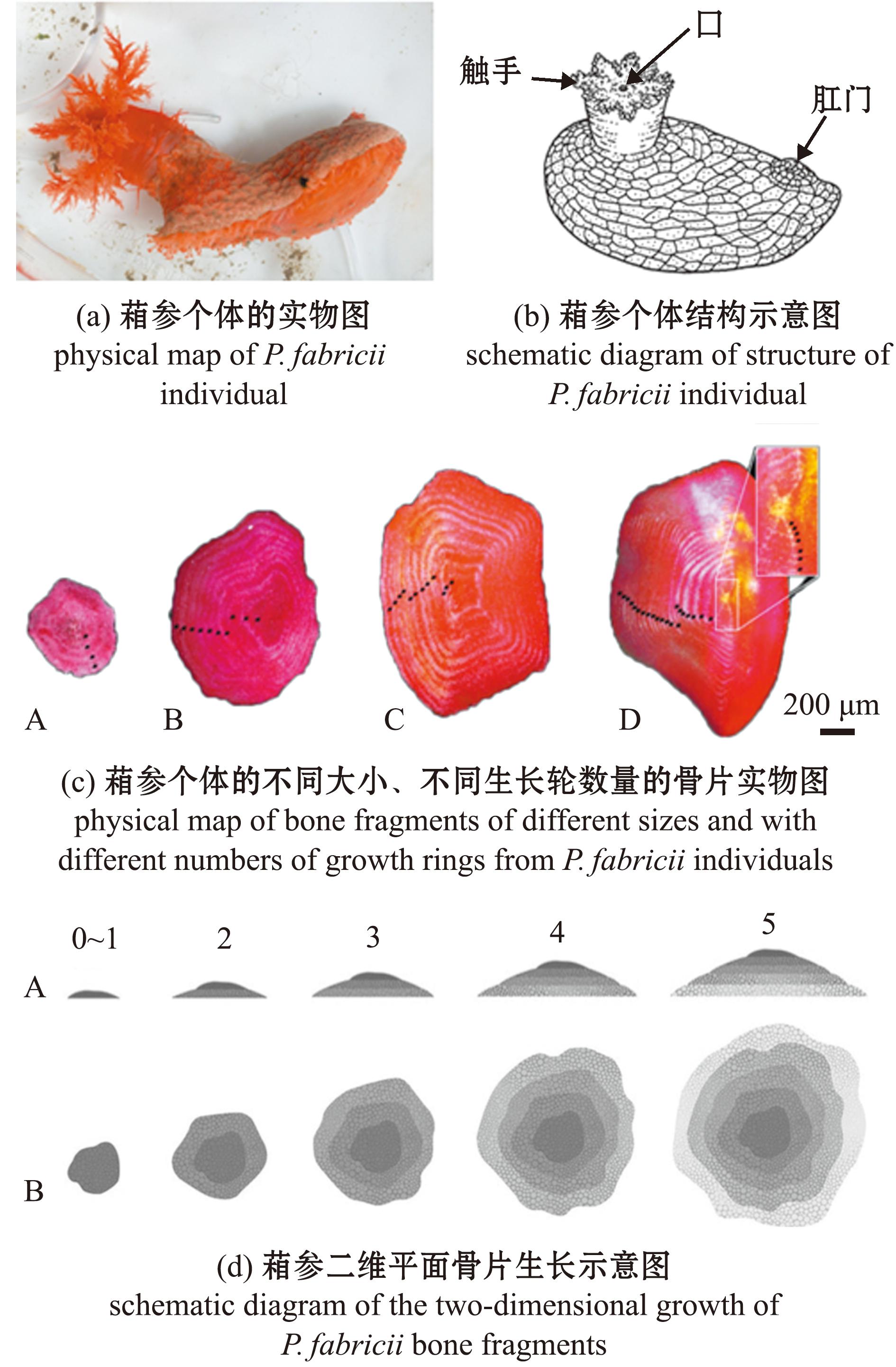 鉴于内骨骼是海参唯一的钙化组织,具有一定的非细胞性和代谢惰性,会随着个体生长发育不断钙化;当环境或生理的变化打破个体生长节奏时,极有可能在内骨骼上形成特定的微结构或微化学“标记”,反映了个体生活史所经历的如初次摄食、附着变态、栖息地转换等重要事件或关键阶段。国外学者很早就发现海参幼体和成体的骨片在大小和形状上有所不同,推测海参内骨骼(骨片和石灰环)可随个体生长而发生形态变化,并着重描述了楯手目海参的特征骨片(如桌形体、杆状体等)有“大小”(越来越大或越来越小)和“有无”(幼体有而成体无,或反之亦然)变化,石灰环有内径大小之变化,据此将海参内骨骼划分成若干阶段[52-53]。近年来,国内学者在研究海参骨片形态学时也发现,1~3龄海参各组织间的骨片类型及其相对比例存在一定差异[37]。因此,海参内骨骼有望成为年龄鉴定的可靠材料。