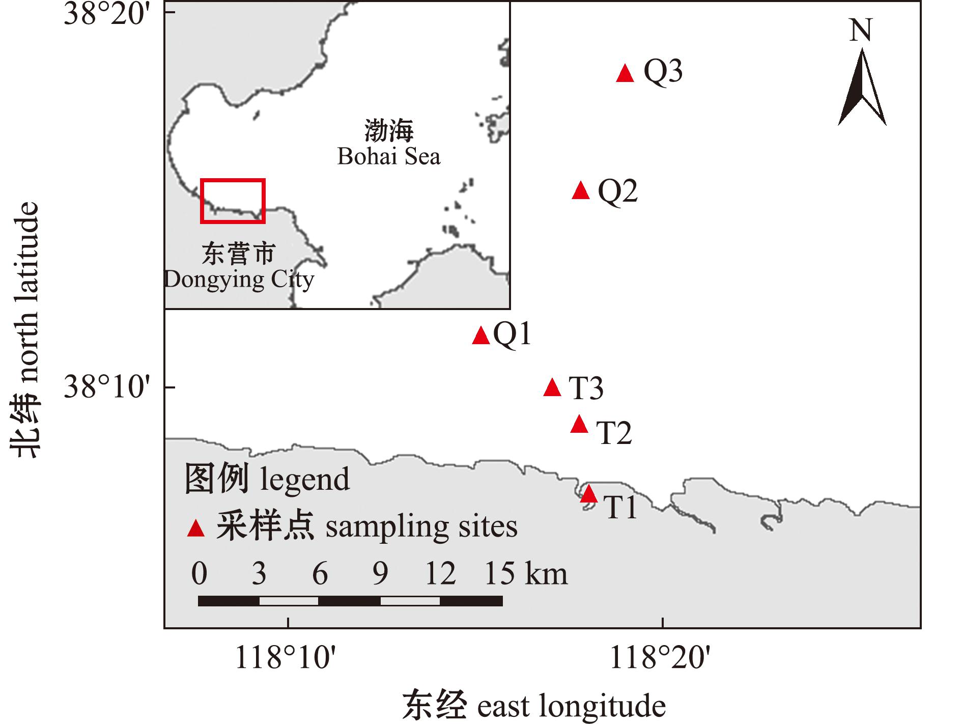 采样海区为东营市河口区马新河入海口贝类养殖区,位于渤海湾南岸,与黄河三角洲海域相连。采样站位如图1所示,在养殖区有代表性地选取6个站位,其中T1、T2、T3站位位于滩涂区,Q1、Q2、Q3站位位于浅海区,T1、T2、T3、Q1、Q2、Q3 6个采样站位平均水深依次为1.0~1.5、1.0~1.6、1.6~1.8、2.1~2.8、6.3~8.0、9.6~15.0 m,采样时间依次为2020年12月8日(冬)、2021年3月30日(春)、2021年6月26日(夏)和2021年10月30日(秋)。每次采样均在上午高潮位时进行,使用有机玻璃柱状采水器采水,水体的温度、盐度、pH和溶解氧等采用便携式水质分析仪(美国YSI公司,Professional Plus)现场测定,海水透明度采用透明度盘测定。采样站位的一般环境条件见表1。