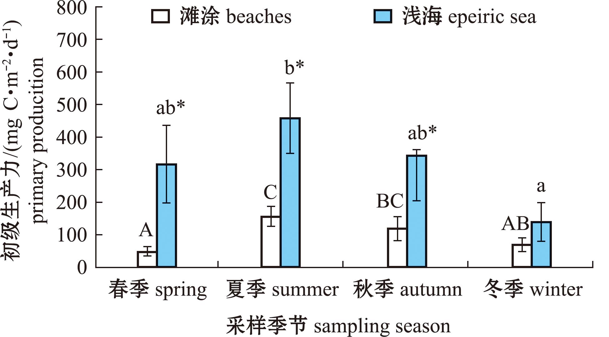 从图3可见,养殖海区初级生产力全年平均值为(199.46±138.89) mg C/(m2·d),范围为35.60~597.81 mg C/(m2·d);空间分布上,滩涂区初级生产力平均值为(101.24±50.68)mg C/(m2·d),显著高于浅海[(297.67±125.83) mg C/(m2·d)](P<0.05);季节变化上,滩涂区和浅海区变化规律相同,均为冬、春季较低,夏、秋季较高,养殖海区总体上夏季初级生产力最高,冬季最低,且两者间有显著性差异(P<0.05),其他季节间均无显著性差异(P>0.05)。