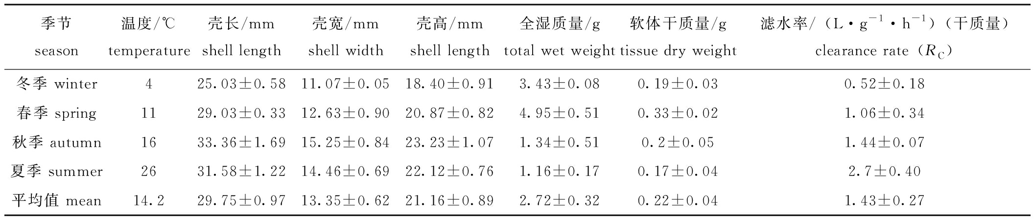 季节season温度/℃temperature壳长/mmshell length壳宽/mmshell width壳高/mmshell length全湿质量/gtotal wet weight软体干质量/gtissue dry weight 滤水率/(L·g-1·h-1)(干质量)clearance rate(RC)冬季 winter425.03±0.5811.07±0.0518.40±0.913.43±0.080.19±0.030.52±0.18春季 spring1129.03±0.3312.63±0.9020.87±0.824.95±0.510.33±0.021.06±0.34秋季 autumn1633.36±1.6915.25±0.8423.23±1.071.34±0.510.2±0.051.44±0.07夏季 summer2631.58±1.2214.46±0.6922.12±0.761.16±0.170.17±0.042.7±0.40平均值 mean 14.229.75±0.9713.35±0.6221.16±0.892.72±0.320.22±0.041.43±0.27