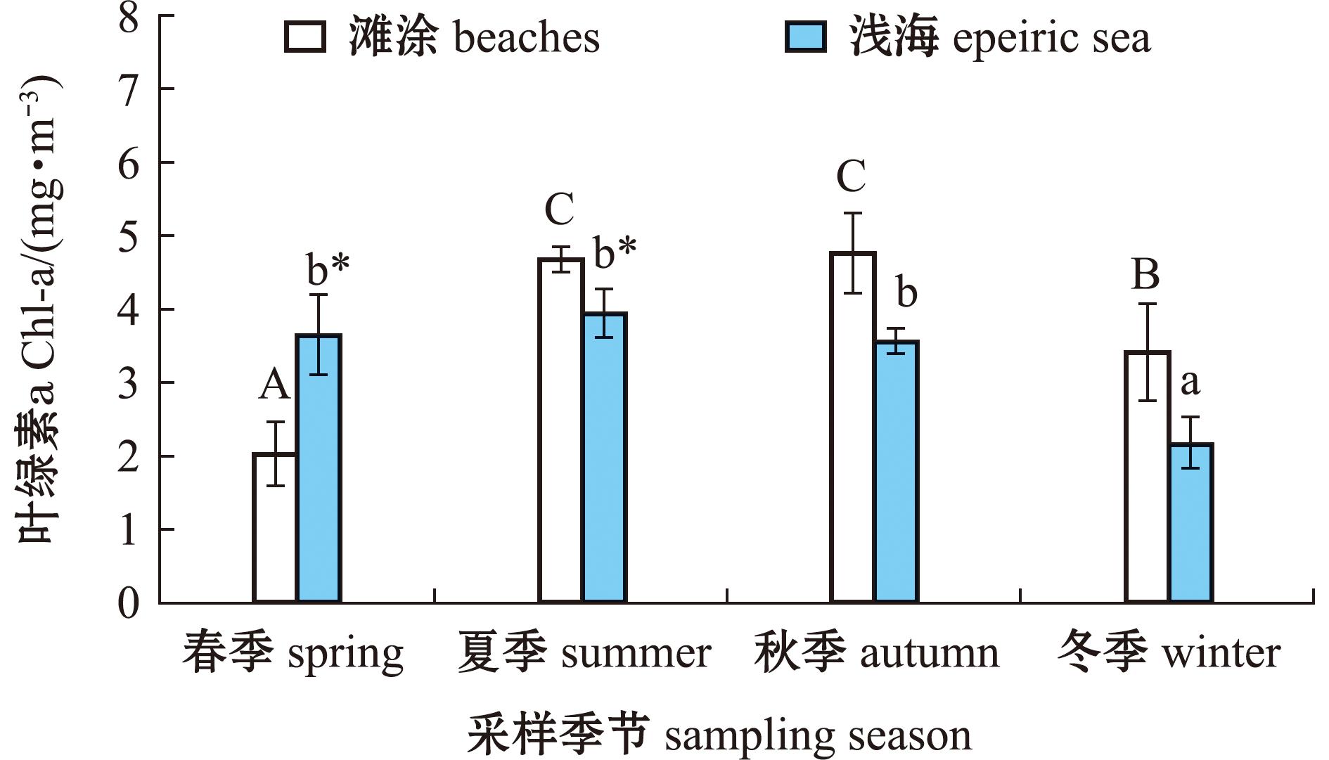 标有不同小写或大写字母者表示同一调查区域不同季节间有显著性差异(P<0.05),标有相同字母者表示组间无显著性差异(P>0.05);*表示同一季节两区域间有显著性差异(P<0.05),下同。