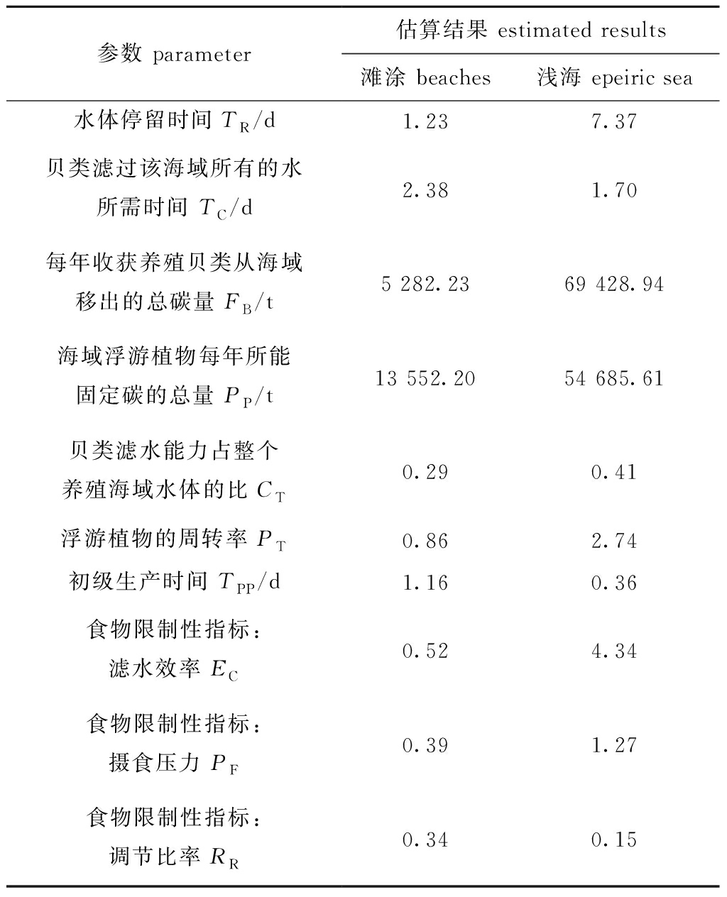 参数 parameter估算结果 estimated results滩涂 beaches浅海 epeiric sea水体停留时间TR/d1.237.37贝类滤过该海域所有的水所需时间 TC/d2.381.70每年收获养殖贝类从海域移出的总碳量 FB /t5 282.2369 428.94海域浮游植物每年所能固定碳的总量 PP/t13 552.2054 685.61贝类滤水能力占整个养殖海域水体的比 CT0.290.41浮游植物的周转率 PT0.862.74初级生产时间 TPP/d1.160.36食物限制性指标:滤水效率 EC0.524.34食物限制性指标:摄食压力 PF0.391.27食物限制性指标:调节比率 RR0.340.15