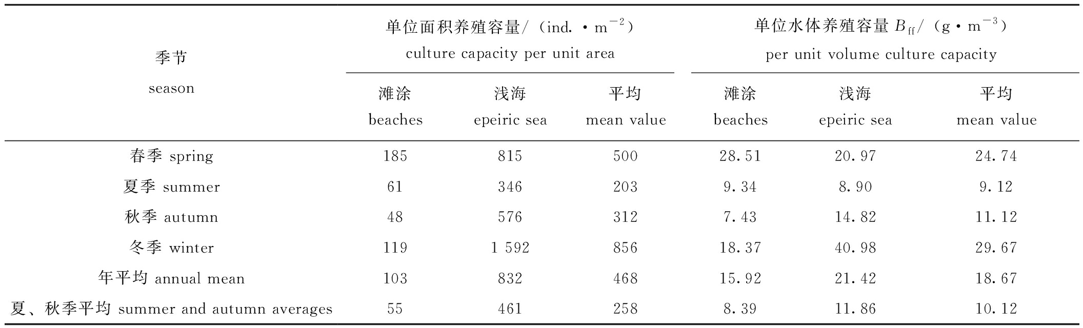 季节season单位面积养殖容量/(ind.·m-2)culture capacity per unit area单位水体养殖容量Bff/(g·m-3)per unit volume culture capacity滩涂beaches浅海epeiric sea平均mean value滩涂beaches浅海epeiric sea平均mean value春季 spring18581550028.5120.9724.74夏季 summer613462039.348.909.12秋季 autumn485763127.4314.8211.12冬季 winter1191 59285618.3740.9829.67年平均 annual mean10383246815.9221.4218.67夏、秋季平均 summer and autumn averages554612588.3911.8610.12