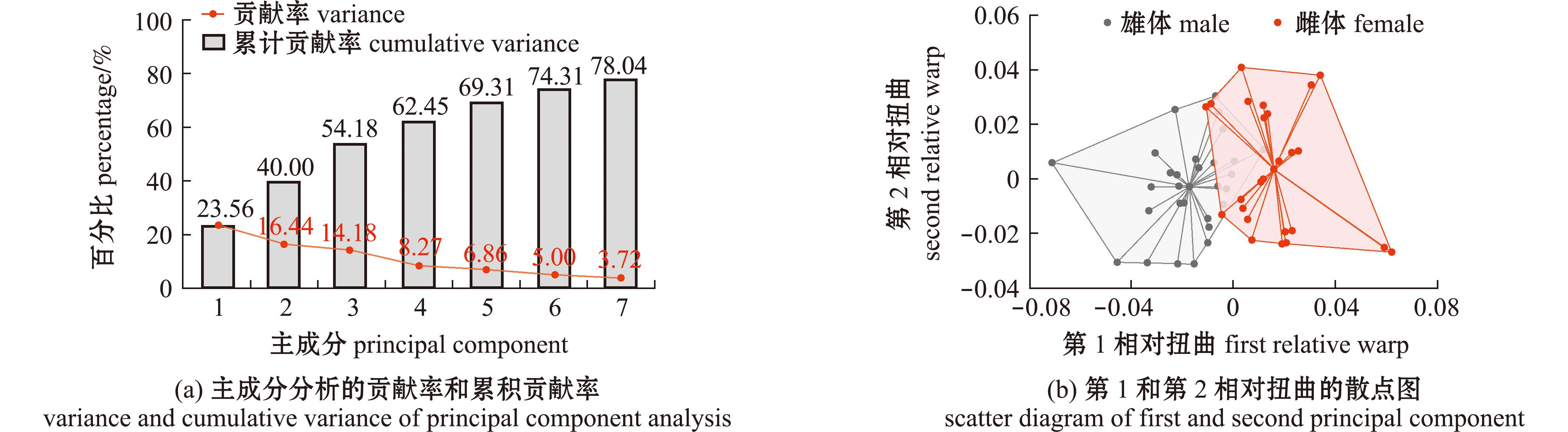 2.2.2 主成分分析 绿鳍马面鲀地标点的贡献率和累计贡献率如图7(a)所示,利用Paleontological Statistics 4软件对标准化地标点数据进行的主成分分析中,按照累计贡献率大于80%的原则共提出7个主成分,在第4主成分时累计贡献率均达60%以上,其中,第1主成分和第2主成分的累计贡献率分别为23.56%和40.00%,降维效果较好;地标点的第1和第2相对扭曲的散点图如图7(b)所示,雄体和雌体虽然未形成独立集中区域,但只存在少数散点会形成交叉,相较于传统形态学测量方法主成分分析结果而言,雌雄两组分离得更加清晰。