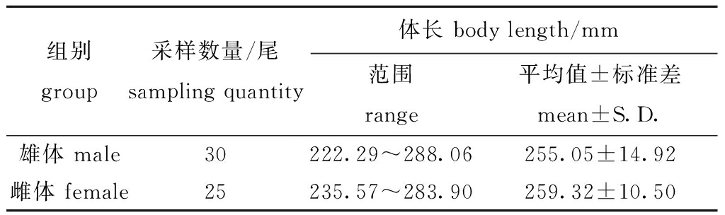 组别group采样数量/尾sampling quantity体长 body length/mm范围range平均值±标准差mean±S.D.雄体 male30222.29~288.06255.05±14.92雌体 female25235.57~283.90259.32±10.50