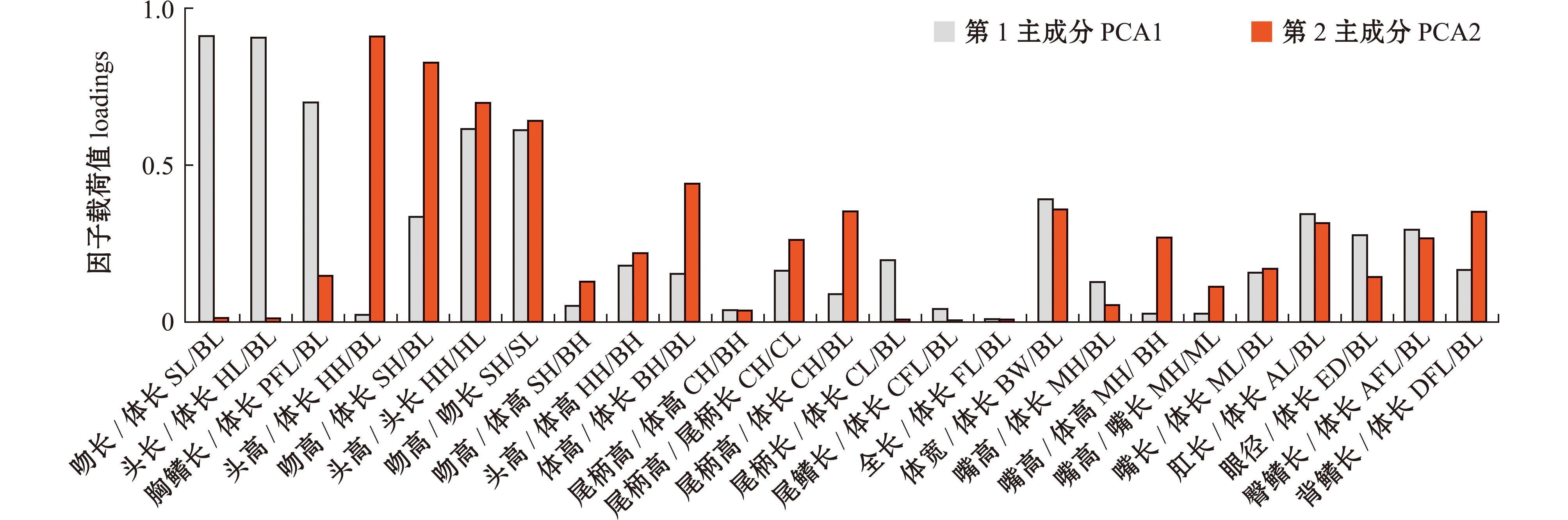 不同主成分与原有变量指标间的关联程度可以由因子载荷值体现,图4为经正交旋转变化第1和第2主成分的因子载荷矩阵,第1主成分在吻长/体长、头长/体长和胸鳍长/体长上的载荷值较大,即第1主成分与以上形态性状相关程度较高,而第2主成分与头高/体长、吻高/体长、头高/头长和吻高/吻长的相关程度较高,这些指标可以在一定程度上代表绿鳍马面鲀雌雄之间的形态差异情况。