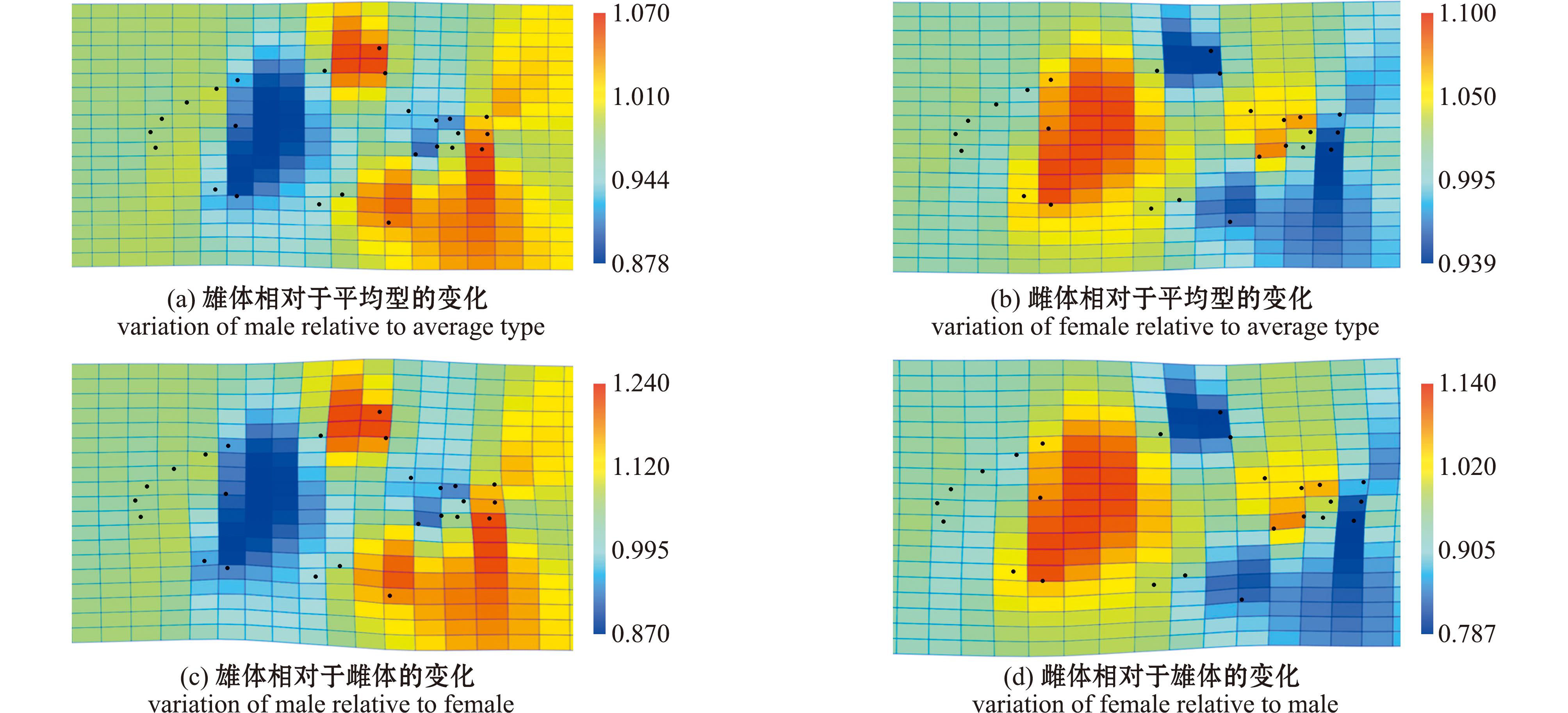 1.3.2 几何形态学数据分析 采用tpsRelw软件获得绿鳍马面鲀的平均型和重叠型,同时采用CoordGen 8软件经普氏叠加得出地标点的分布情况,对每个样本的地标点进行平移置中、旋转和缩放等处理,去除非形状差异并得到标准化数据。为清晰了解雌雄形态差异,利用Paleontological Statistics 4软件进行薄板样条分析,绘出雌、雄体和平均型之间相互变换的网格变形图,方便对其进行可视化分析。
