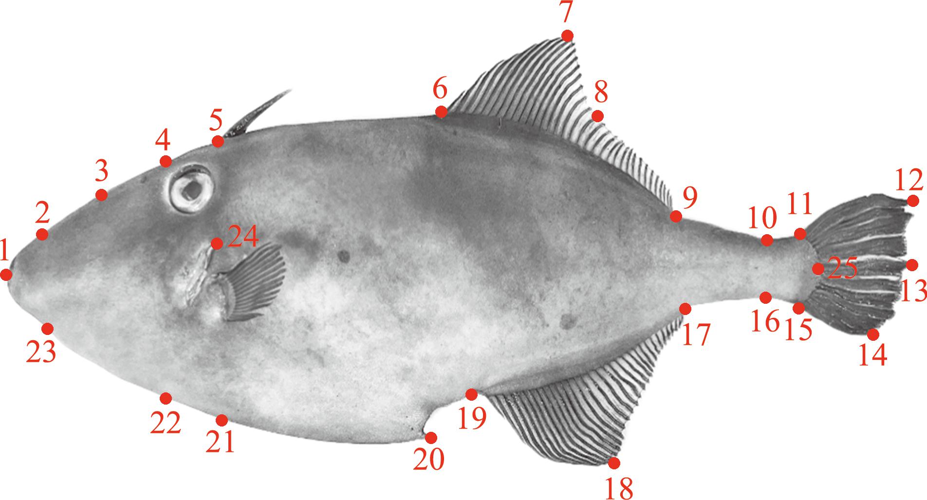 1.2.2 图像拍摄和地标点建立 鱼体形态特征测量完毕后,放置在已固定单反相机(Canon 5D Mark Ⅱ)的载物台上进行二维影像的拍摄,拍摄前整理鱼体和鱼鳍形态,使其自然伸展,鱼体放置于成像区域的正中位置,与单反相机的距离保持在30 cm左右,所有样本拍摄时的摆放位置及相机聚焦部位均一致。根据地标点选取特征明显性、代表性、稳定性和可重复性的原则,共选取25个地标点,各具体地标点的位置如图2所示,使用tpsUtil软件将所有拍摄的图像进行数据处理并建立tps文件,使用tpsDig软件在已处理图像上依次按顺序建立地标点,获取所有样本地标点的x,y坐标值并建立数据文件后进行数据处理。