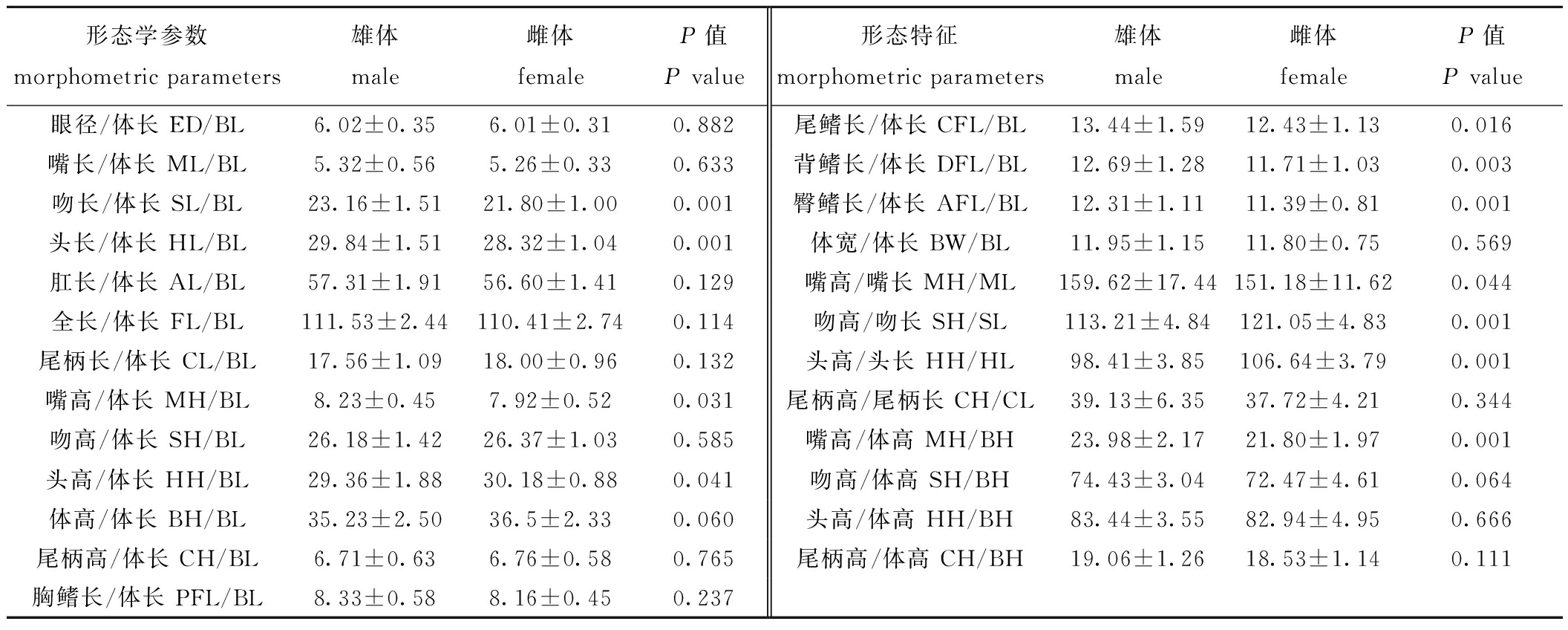 形态学参数morphometric parameters雄体male雌体femaleP值P value形态特征morphometric parameters雄体male雌体femaleP值P value眼径/体长 ED/BL6.02±0.356.01±0.310.882尾鳍长/体长 CFL/BL13.44±1.5912.43±1.130.016嘴长/体长 ML/BL5.32±0.565.26±0.330.633背鳍长/体长 DFL/BL12.69±1.2811.71±1.030.003吻长/体长 SL/BL23.16±1.5121.80±1.000.001臀鳍长/体长 AFL/BL12.31±1.1111.39±0.810.001头长/体长 HL/BL29.84±1.5128.32±1.040.001体宽/体长 BW/BL11.95±1.1511.80±0.750.569肛长/体长 AL/BL57.31±1.9156.60±1.410.129嘴高/嘴长 MH/ML159.62±17.44151.18±11.620.044全长/体长 FL/BL111.53±2.44110.41±2.740.114吻高/吻长 SH/SL113.21±4.84121.05±4.830.001尾柄长/体长 CL/BL17.56±1.0918.00±0.960.132头高/头长 HH/HL98.41±3.85106.64±3.790.001嘴高/体长 MH/BL8.23±0.457.92±0.520.031尾柄高/尾柄长 CH/CL39.13±6.3537.72±4.210.344吻高/体长 SH/BL26.18±1.4226.37±1.030.585嘴高/体高 MH/BH23.98±2.1721.80±1.970.001头高/体长 HH/BL29.36±1.8830.18±0.880.041吻高/体高 SH/BH74.43±3.0472.47±4.610.064体高/体长 BH/BL35.23±2.5036.5±2.330.060头高/体高 HH/BH83.44±3.5582.94±4.950.666尾柄高/体长 CH/BL6.71±0.636.76±0.580.765尾柄高/体高 CH/BH19.06±1.2618.53±1.140.111胸鳍长/体长 PFL/BL8.33±0.588.16±0.450.237