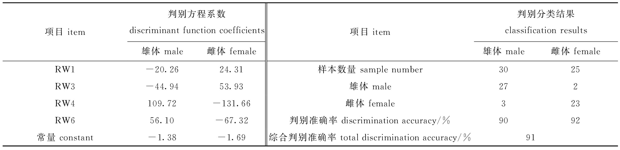项目 item判别方程系数discriminant function coefficients雄体 male雌体 female项目 item判别分类结果classification results雄体 male雌体 femaleRW1-20.2624.31样本数量 sample number3025RW3-44.9453.93雄体 male272RW4109.72-131.66雌体 female323RW656.10-67.32判别准确率 discrimination accuracy/%9092常量 constant-1.38-1.69综合判别准确率 total discrimination accuracy/% 91