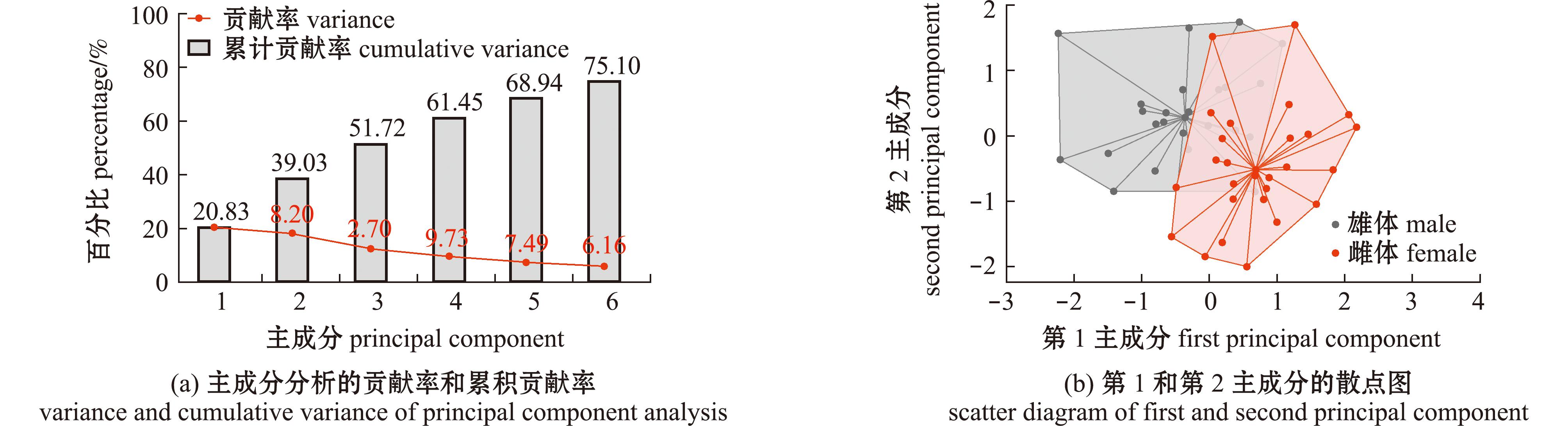 2.1.2 主成分分析 绿鳍马面鲀形态特征的贡献率和累计贡献率如图3(a)所示,按照累计贡献率大于80%的原则共提出6个主成分,在第4主成分时累计贡献率均达60%,其中第1主成分和第2主成分的累计贡献率分别为20.83%和39.03%;形态特征的第1和第2主成分散点图如图3(b)所示,雄体和雌体并未分别形成独立集中区域,均存在部分散点形成交叉,但通过主成分分析大体可以将雌体与雄体进行区分。