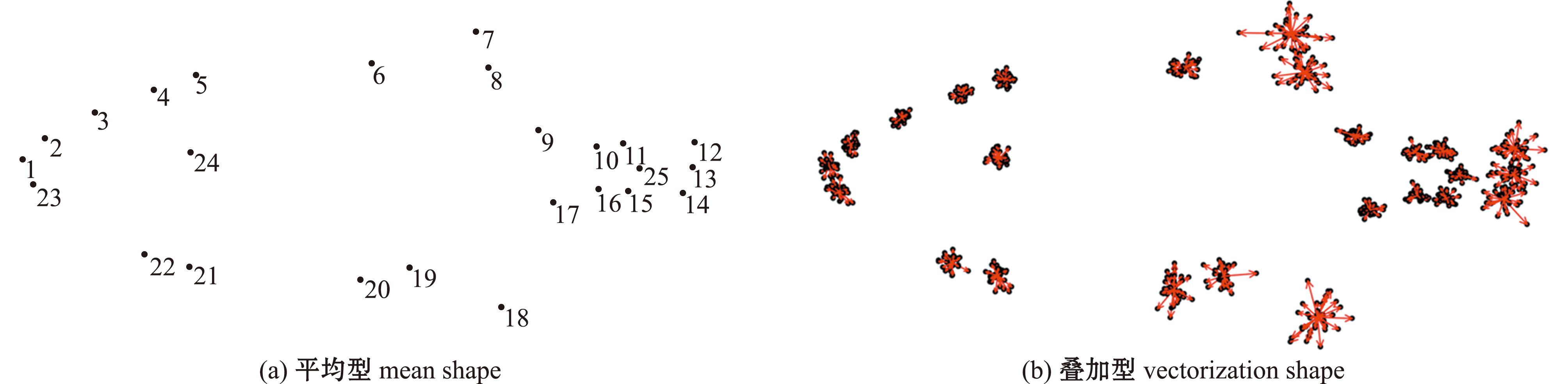 2.2.1 变形图 采用tpsRelw软件将所有样本的地标点数据进行标准化处理,得到所有样本的平均型如图5(a)所示,图5(a)直观展现了雌雄绿鳍马面鲀的典型形态特征,为后续的分析提供基础参照。图5(b)展示了所有地标点矢量化重叠效果,发现不同地标点的重叠程度存在差异,某些位置的地标点重叠程度较高,在形态上具有较高的相似性,如地标点3、4、5、24等,而有些位置的地标点重叠程度相对较低,不同样本间形态存在差异如地标点7、8、18、19、20等。