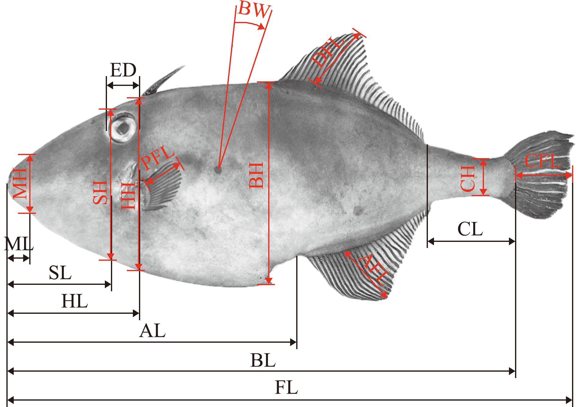 图1 绿鳍马面鲀形态特征参数测量示意图