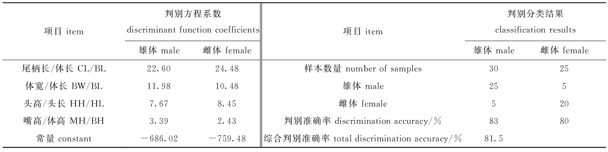 表3 不同性别绿鳍马面鲀形态特征的判别方程系数和判别分类